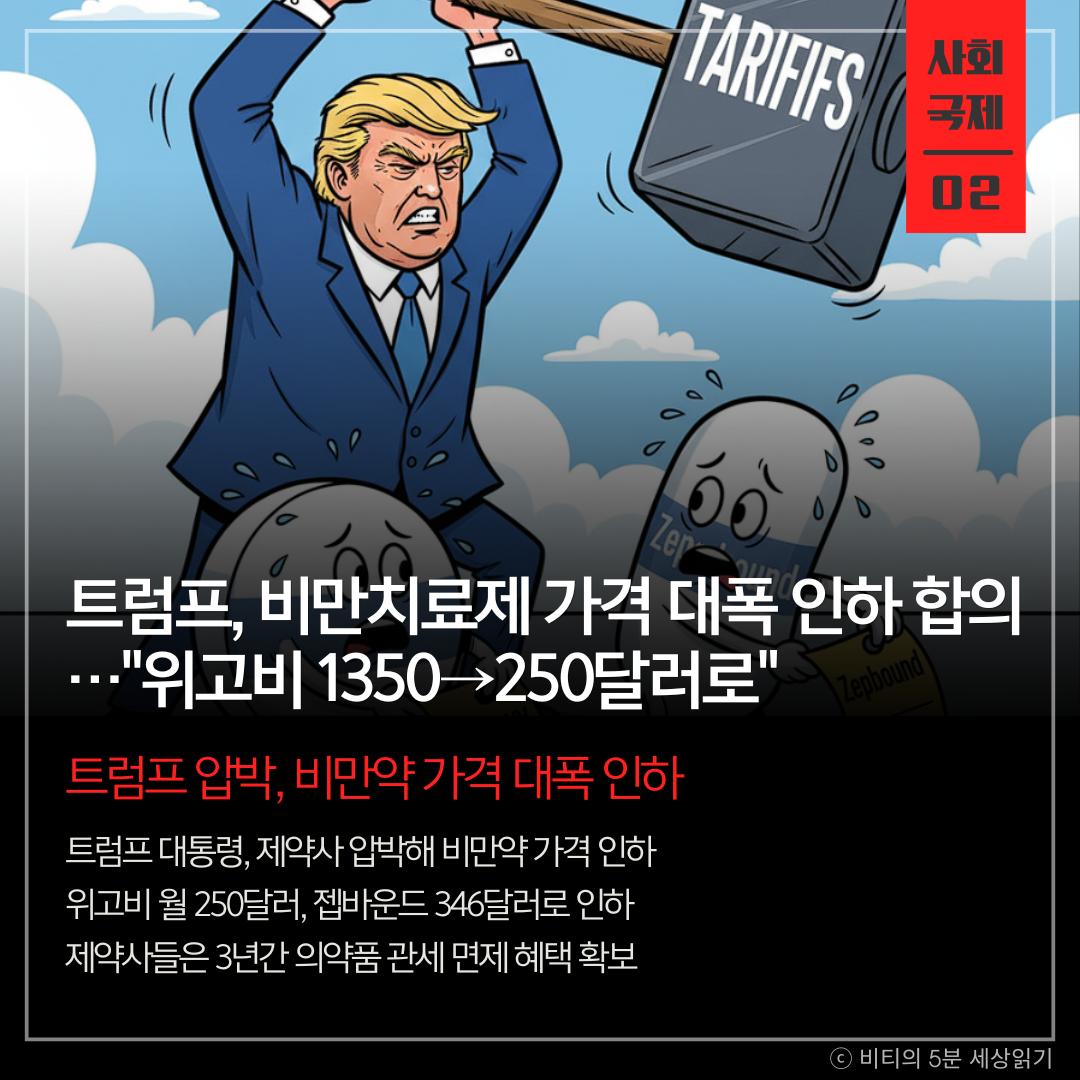 트럼프 대통령이 제약사를 압박해 '위고비'와 '젭바운드' 가격을 대폭 인하했다. 제약사들은 3년간 관세를 면제받고, 소비자들은 '트럼프알엑스' 플랫폼을 통해 약을 구매한다.