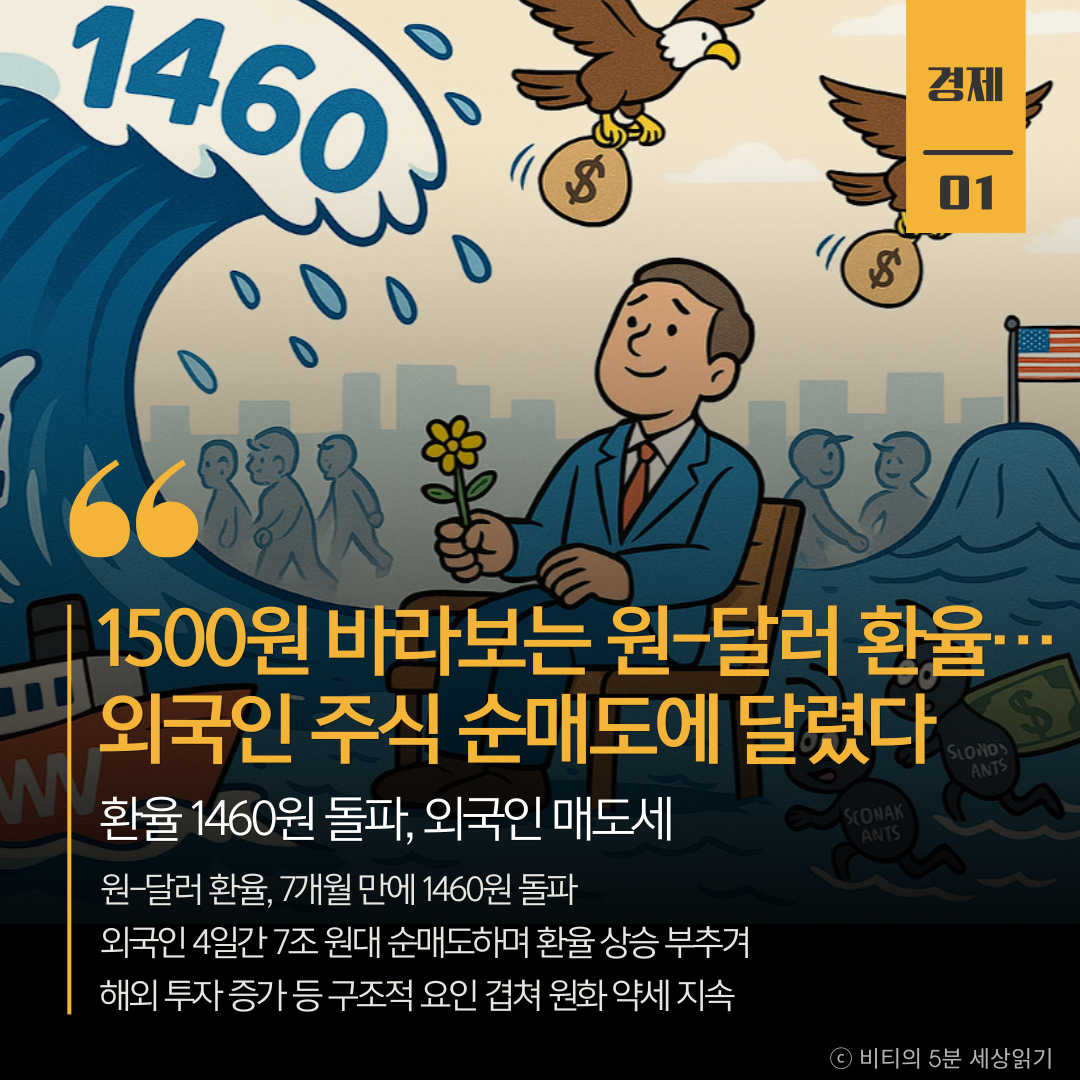 미국발 AI 거품 논란과 고용 부진 우려로 외국인이 4일간 7조 원 넘게 주식을 팔아치우면서 원·달러 환율이 7개월 만에 1460원을 넘어섰다. 서학개미의 해외 투자 증가 등 구조적 요인까지 겹쳐 원화 약세 압력이 커지고 있다.
