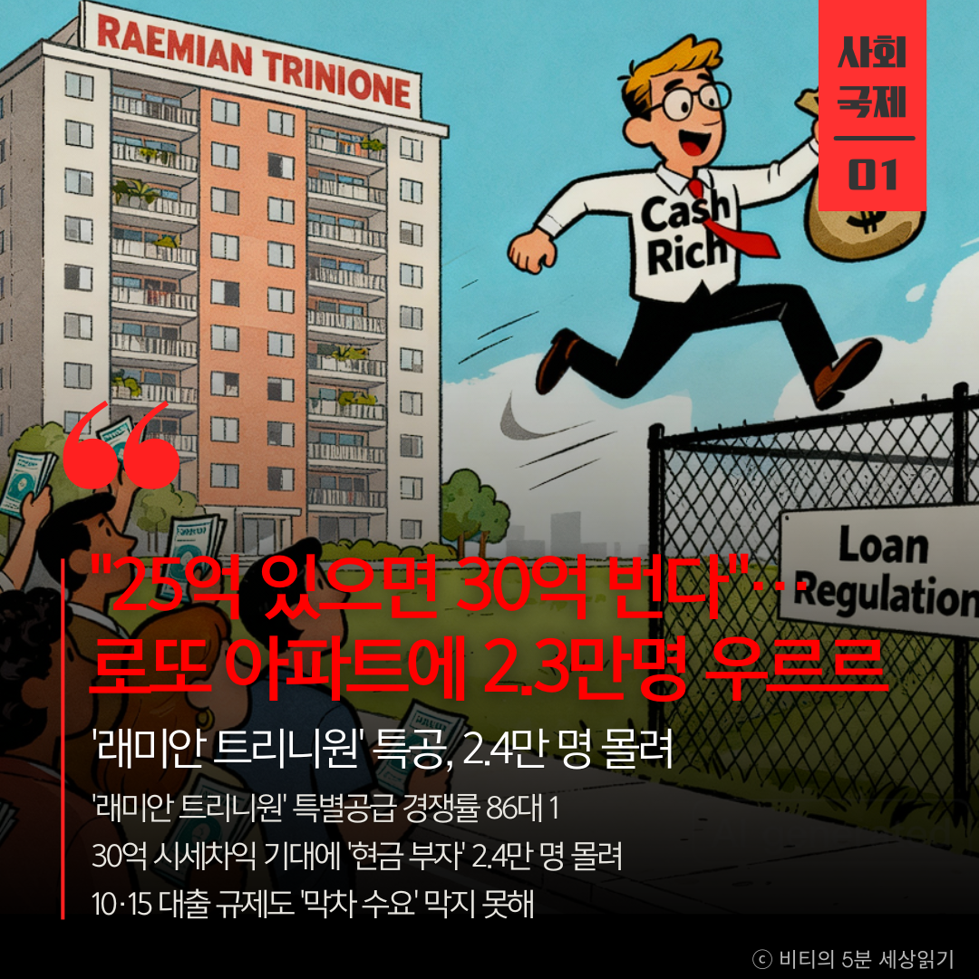 '래미안 트리니원' 특별공급에 2만 3천여 명이 몰렸다. 10·15 대출 규제로 25억 원 이상의 현금이 필요함에도, 30억 원대 시세차익을 기대하는 '현금 부자'들이 대거 청약에 나섰다.