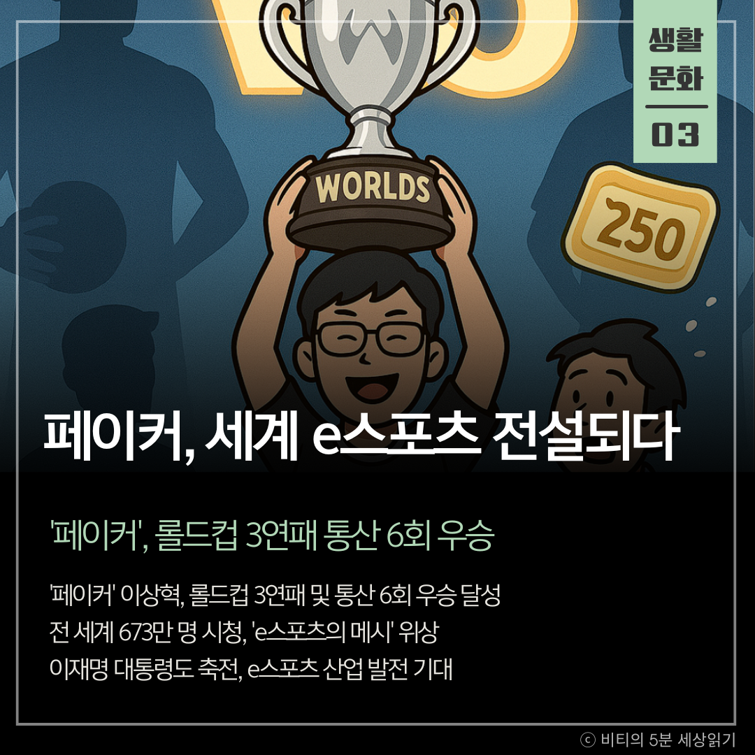 '페이커' 이상혁이 이끄는 T1이 '월드 2025' 결승전에서 3대 2로 승리하며 3회 연속 우승을 달성했다. 페이커는 통산 6회 우승이라는 전무후무한 기록으로 'e스포츠의 조던, 메시' 반열에 올랐으며, 그의 성실함과 인성도 주목받고 있다.