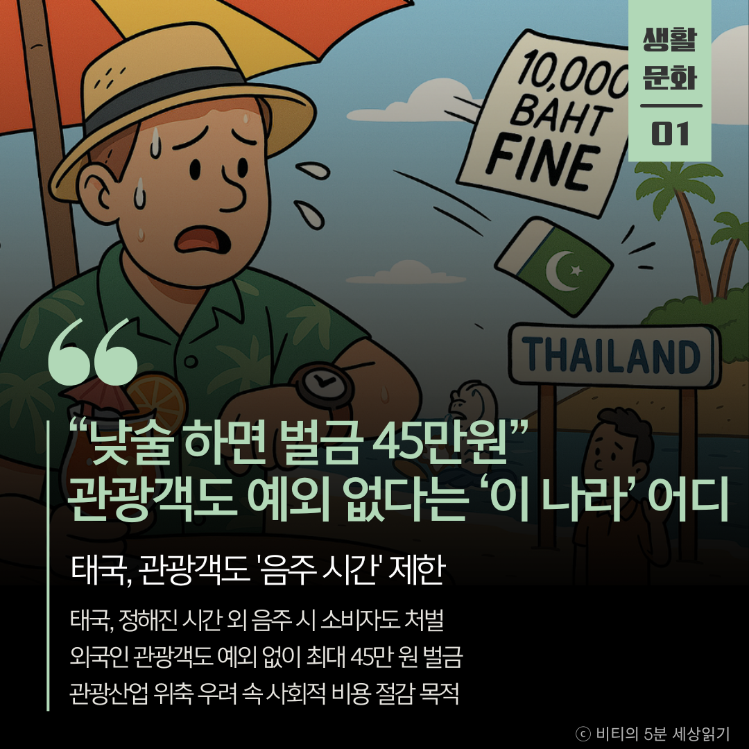 태국이 음주 규제를 강화해, 허용 시간 외에 술을 마시는 소비자(관광객 포함)에게도 벌금을 부과한다. 음주운전 등 사회적 비용 절감이 목적이지만, 관광산업 위축 우려도 나온다.