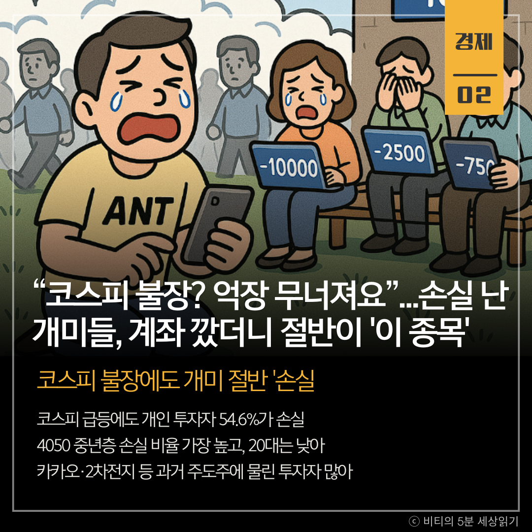 코스피가 4200선을 돌파하는 역대급 강세장에서도 개인 투자자의 절반 이상(54.6%)이 손실을 본 것으로 나타났다. 평균 손실액은 931만 원에 달했으며, 4050 중년층의 투자 성적이 가장 저조했다.