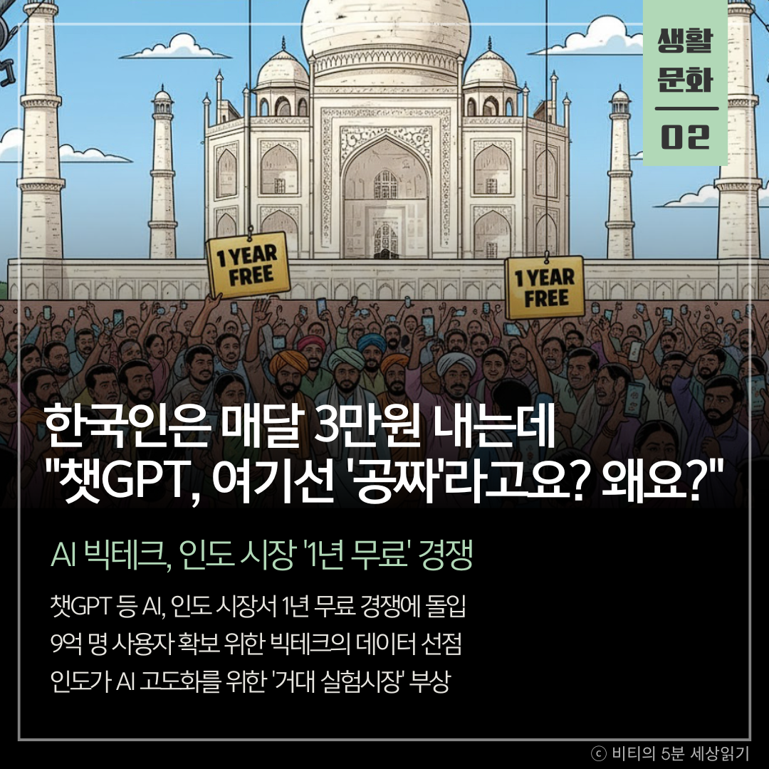 오픈AI, 구글 등 빅테크가 인도 시장 선점을 위해 '1년 무료' AI 서비스 경쟁에 돌입했다. 이는 9억 명의 젊은 사용자를 생태계에 묶어두고 데이터를 선점하려는 전략이다.