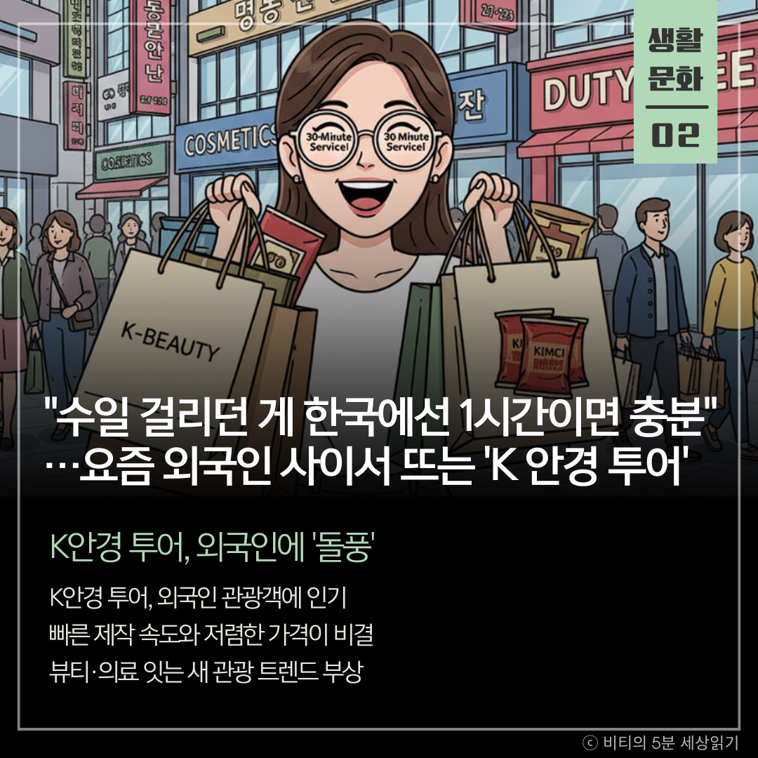 외국인 관광객 사이에서 'K안경 투어'가 새로운 필수 관광 코스로 떠오르고 있다. 30분 만에 완성되는 속도, 저렴한 가격, 세련된 디자인에 힘입어 뷰티·의료 관광을 잇는 새로운 트렌드가 되고 있다.
