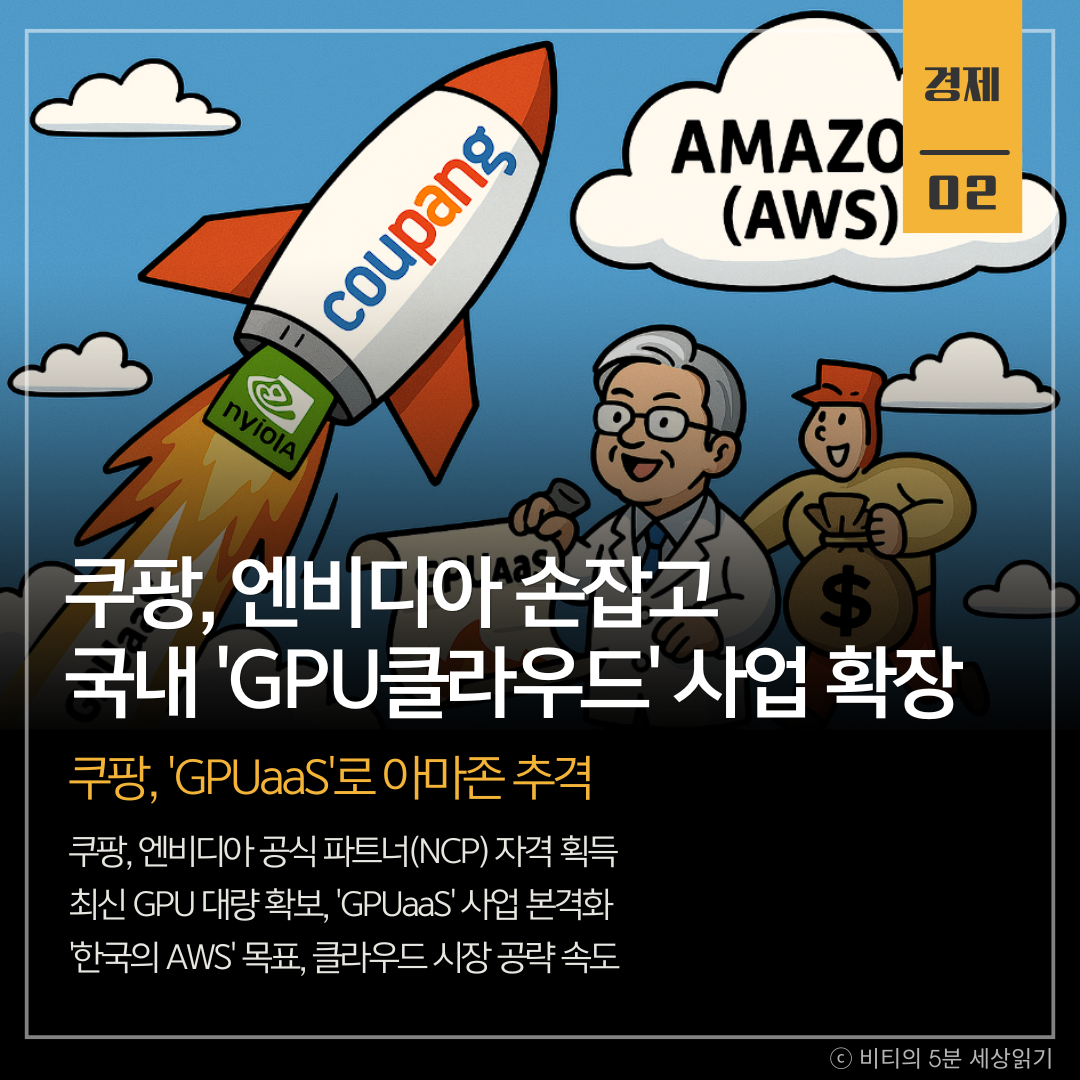 쿠팡이 엔비디아와 협력해 그래픽처리장치(GPU)를 클라우드로 제공하는 'GPUaaS' 사업을 국내에서 본격화합니다. 쿠팡은 최근 '엔비디아 클라우드 파트너'(NCP) 자격을 취득했으며, 이는 네이버클라우드에 이어 국내 두 번째입니다.