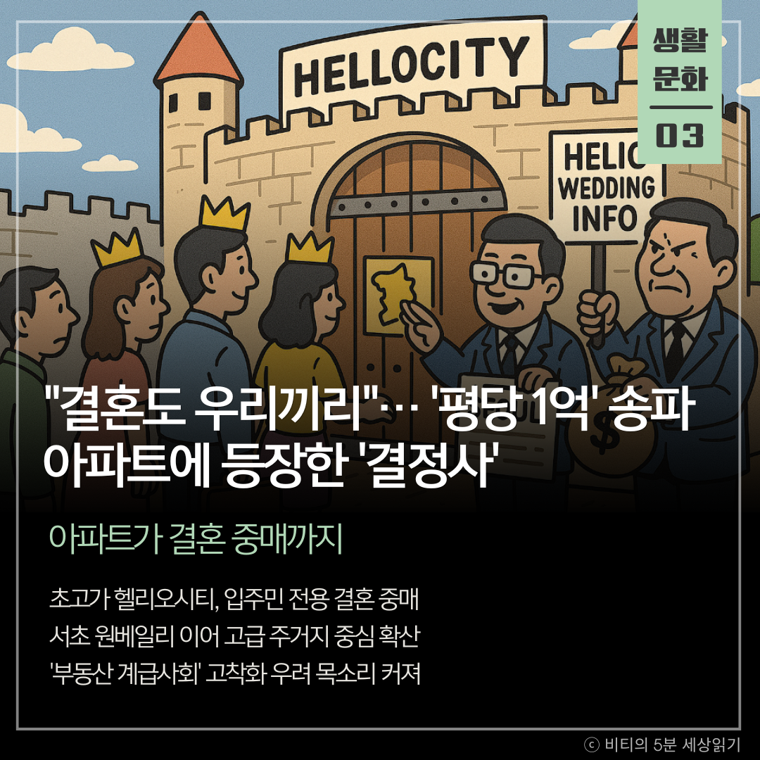 '헬리오시티' 등 초고가 아파트 단지에 입주민 전용 결혼정보회사가 등장해, 아파트가 신분의 척도가 되는 '부동산 계급사회' 논란이 심화되고 있다.