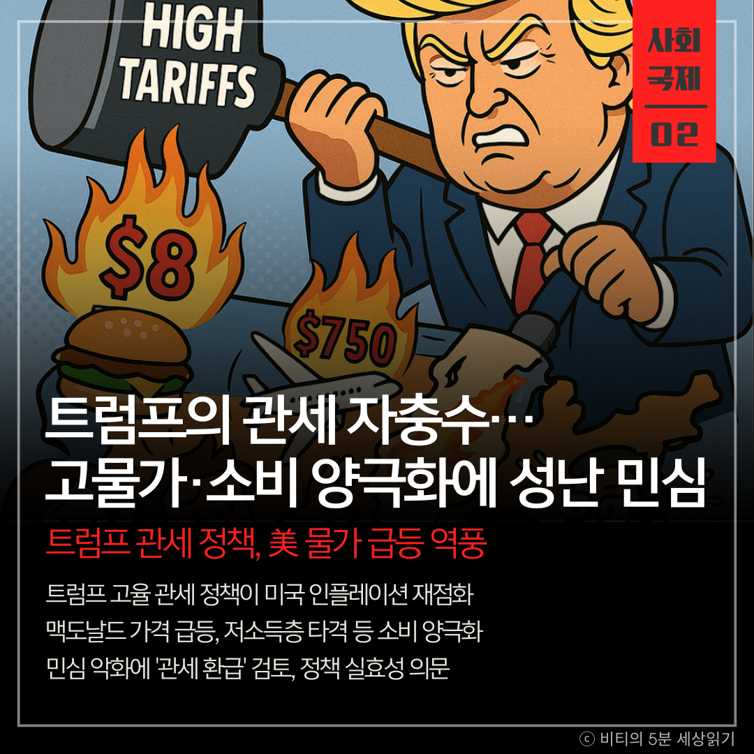 트럼프의 고율 관세 정책이 미국 서민 물가를 다시 급등시켜 민심의 역풍을 맞고 있다. 맥도날드 가격이 40% 치솟는 등 생활 물가 압박이 커지자, 저소득층을 중심으로 불만이 확산되고 있다.