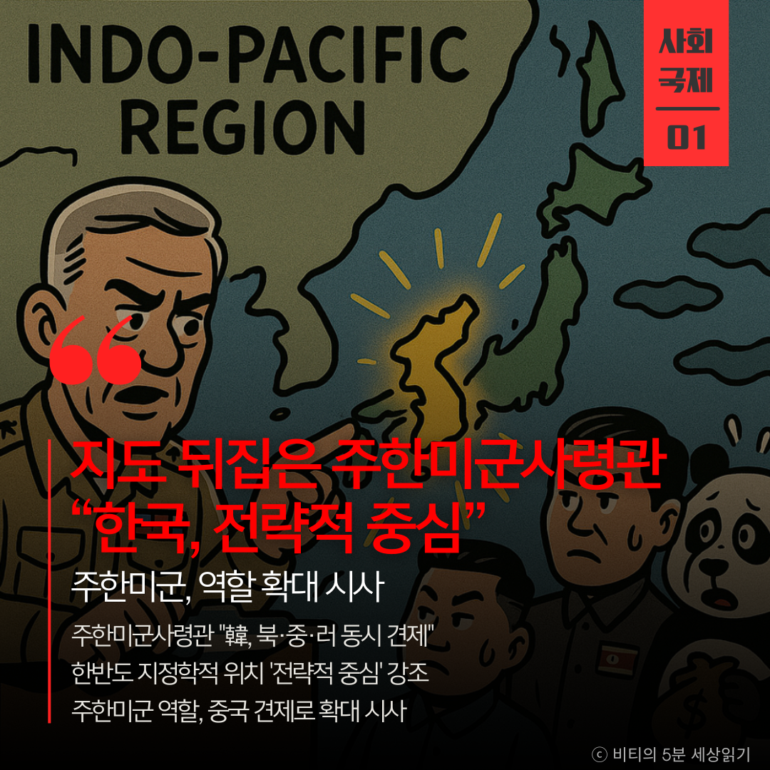 주한미군사령관이 한국의 지정학적 위치가 북한, 중국, 러시아 모두를 견제할 수 있는 '전략적 중심'이라고 강조했다. 이는 주한미군의 역할이 중국·러시아 견제로 확대될 수 있음을 시사한다.