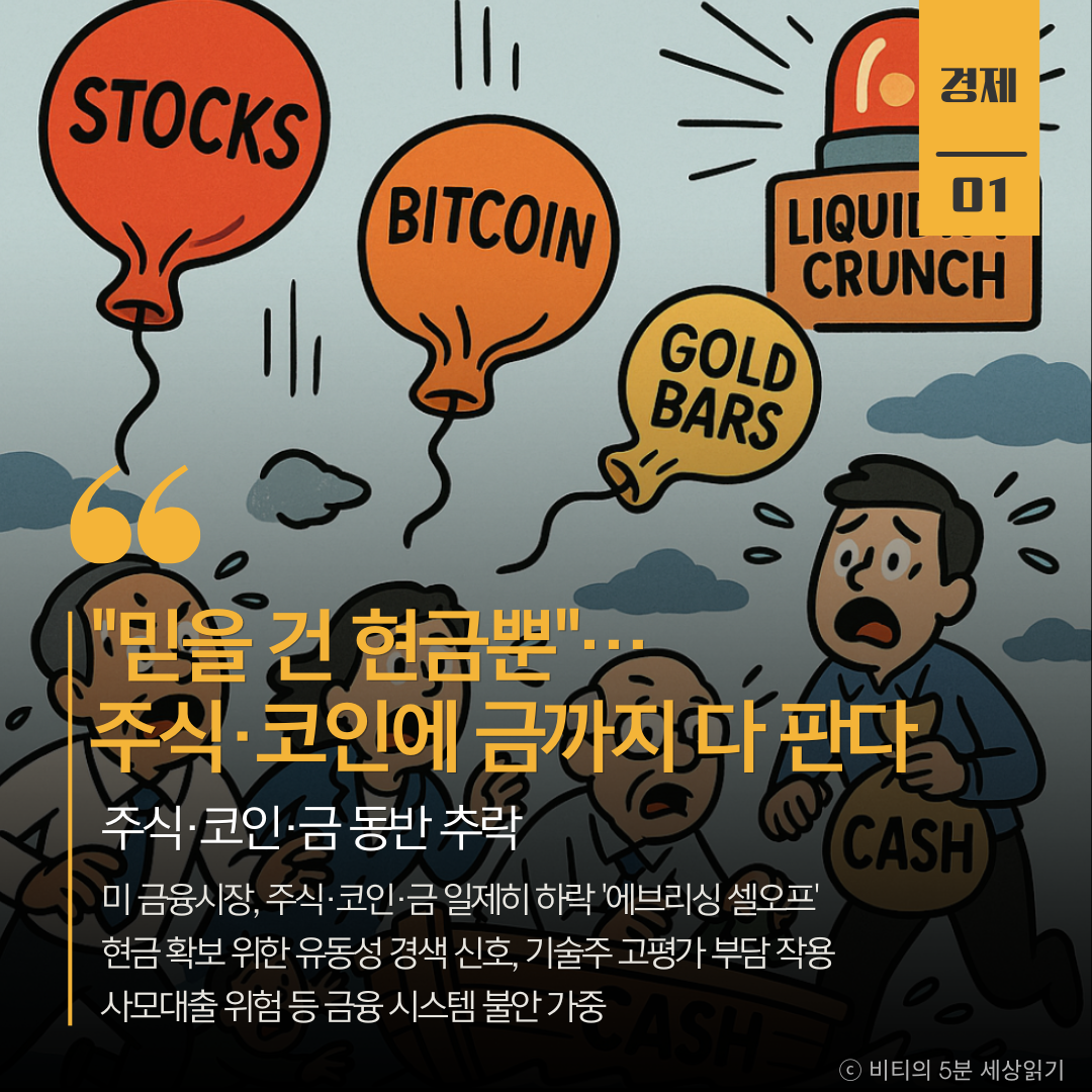 미국 금융시장에서 주식, 비트코인, 금 등 모든 자산이 하락하는 '에브리싱 셀오프' 현상이 나타나고 있다. 이는 단순 조정을 넘어 현금 확보를 위한 유동성 경색 신호로 해석되며, 기술주 고평가 부담과 사모대출 위험 등이 불안을 가중시키고 있다.