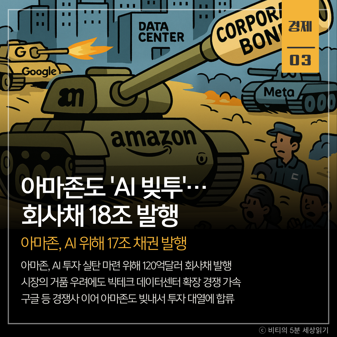 아마존이 AI 데이터센터 확충을 위해 3년 만에 120억 달러 규모 회사채를 발행한다. 거품 우려에도 빅테크들이 빚을 내서라도 AI 인프라 경쟁에 사활을 걸고 있다는 분석이다.