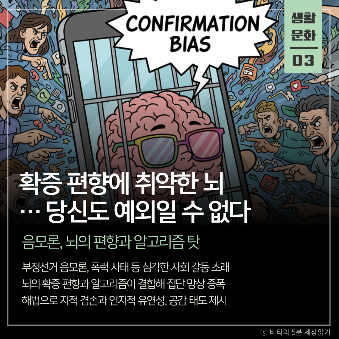 "나는 합리적이고, 너는 세뇌당했다"는 착각이 우리 사회를 병들게 하고 있습니다. 내가 보고 있는 세상이 알고리즘이 만들어준 '거울 방'일 수 있음을 인정하는 용기가 필요합니다.