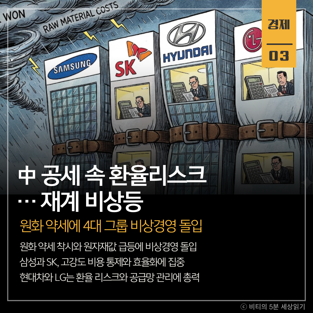 한국 산업계가 원화 약세와 원자재값 급등이라는 이중고에 직면하며 비상경영 체제에 돌입했다. 삼성전자와 SK하이닉스는 사상 최대 실적에도 불구하고 비용 통제와 조직 효율화에 나섰으며, 현대차와 LG는 환율 리스크 관리와 공급망 다변화에 총력을 기울이고 있다.