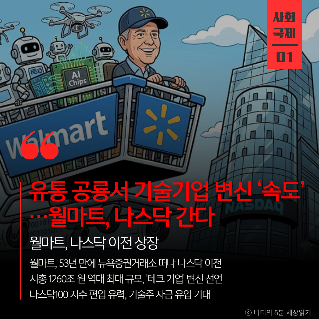 미국 최대 유통 기업 월마트가 53년 만에 뉴욕증권거래소(NYSE)를 떠나 기술 중심의 나스닥으로 상장지를 옮깁니다. 시가총액 1260조 원에 달하는 역대 최대 규모의 이전입니다. 이는 월마트가 단순 유통 기업을 넘어 AI, 로봇, 자동화 기술을 접목한 '기술 기반 기업'으로 체질을 바꾸겠다는 의지의 표현입니다.
