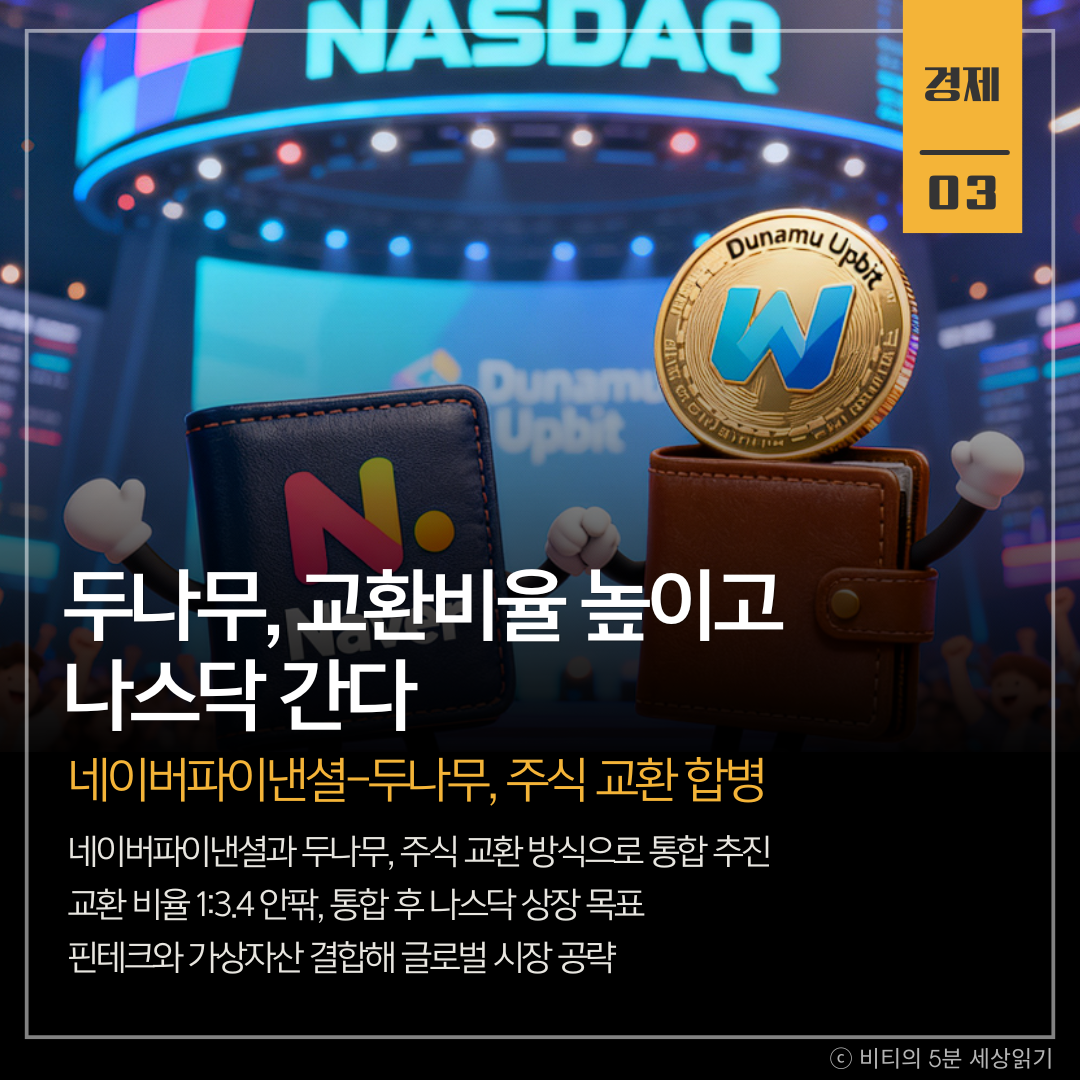 네이버파이낸셜과 두나무가 포괄적 주식 교환을 통해 통합을 추진한다. 교환 비율은 1대 3.4 안팎으로 논의 중이며, 통합 법인은 향후 나스닥 상장을 목표로 한다. 두 회사의 결합은 네이버의 핀테크 인프라와 두나무의 가상자산 노하우를 결합해 글로벌 시장을 공략하려는 전략적 선택이다.