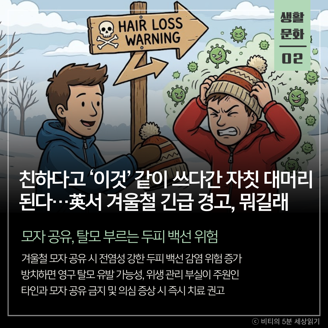 친하다고 ‘이것’ 같이 쓰다간 자칫 대머리된다…英서 겨울철 긴급 경고, 뭐길래