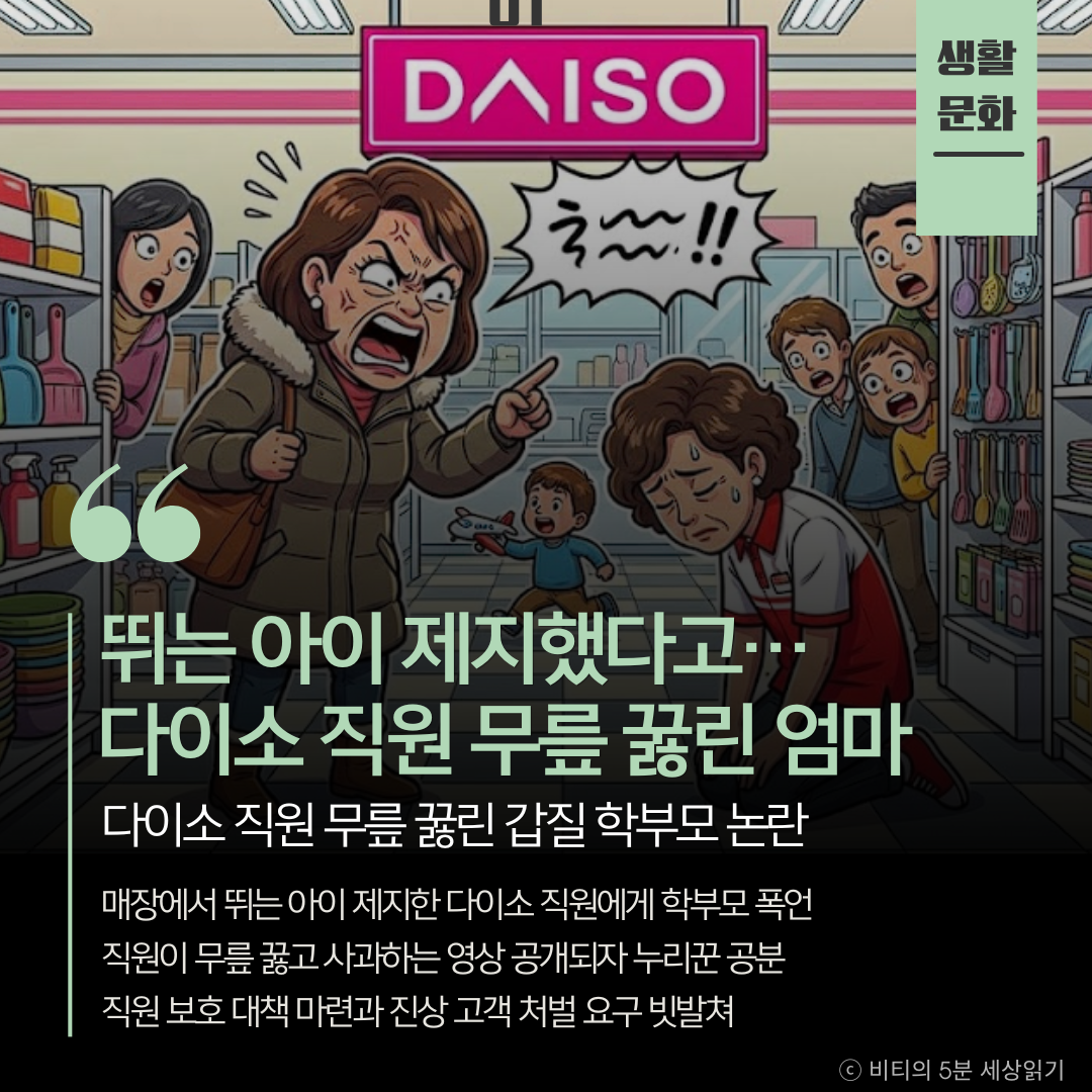 전남의 한 다이소 매장에서 뛰는 아이를 제지한 직원에게 아이 엄마가 폭언을 퍼붓고 무릎까지 꿇린 사건이 발생해 공분을 사고 있다. 누리꾼들은 명백한 갑질이라며 직원 보호 대책을 요구하고 있다.