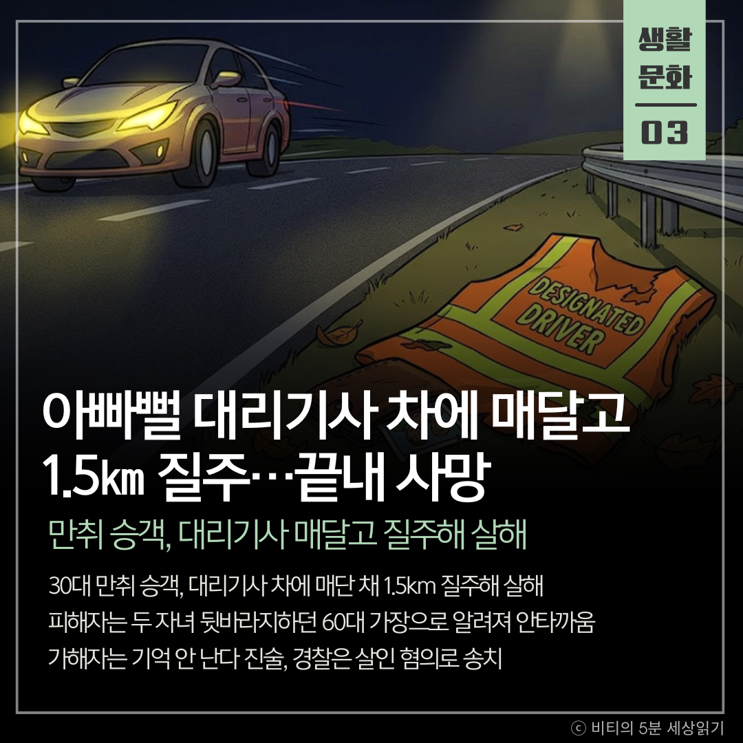 A씨는 면허 취소 수준의 만취 상태였으며 경찰 조사에서 [술에 취해 기억이 나지 않는다]고 진술했습니다. 숨진 B씨는 전직 언론인 출신으로 두 자녀를 뒷바라지하기 위해 10년째 대리운전을 해온 것으로 알려져 공분을 사고 있습니다. 경찰은 A씨를 살인 혐의 등으로 검찰에 넘겼습니다.