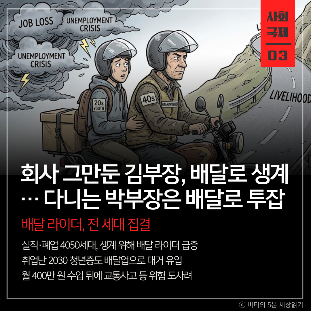 실직과 폐업 등으로 생계가 어려워진 4050세대와 취업난에 시달리는 2030세대가 배달 라이더 시장으로 몰리고 있다. 진입 장벽이 낮고 당장 수입을 올릴 수 있다는 장점 때문이지만, 사고 위험 등 열악한 근무 환경에 대한 우려도 함께 제기된다.