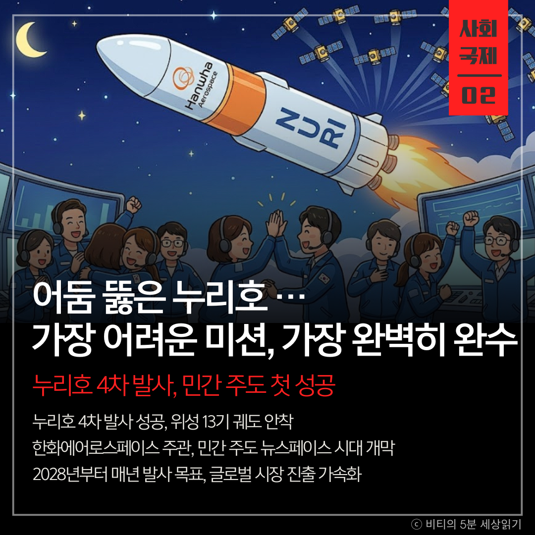 한국형 발사체 누리호가 첫 민간 주도 및 야간 발사에 성공했다. 차세대중형위성 3호 등 역대 최다인 13기 위성을 목표 궤도에 안착시키며 세계 7대 우주 강국 입지를 굳혔다.