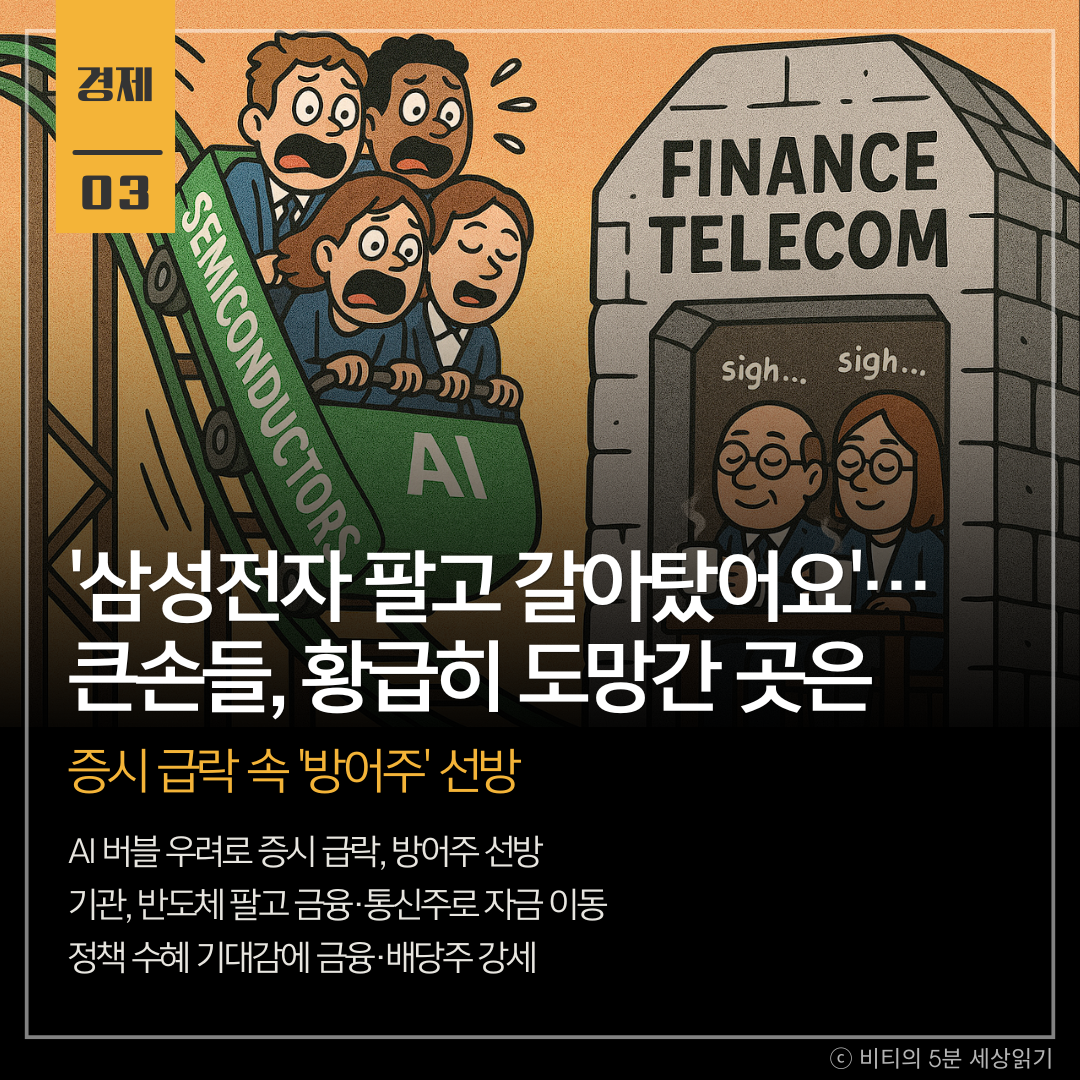 AI 투자 과열 우려로 국내 증시가 급락한 가운데, 기관 투자자들이 반도체 등 급등주를 팔고 금융, 통신 등 방어주와 우량 바이오주로 자금을 옮기며 이들 종목이 선방했다.