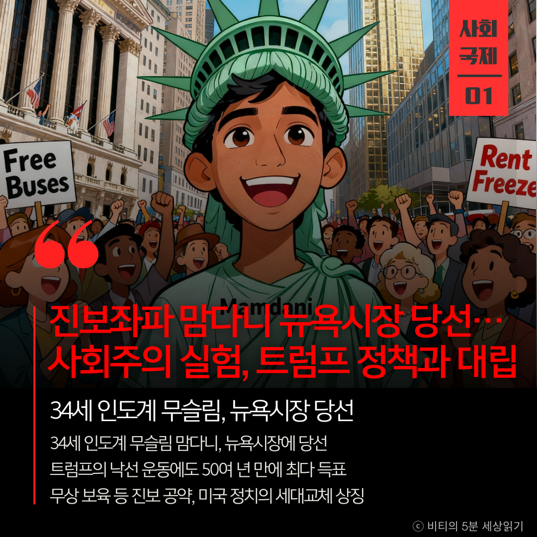 미국 최대 도시 뉴욕의 시장에 34세의 인도계 무슬림 신예 조란 맘다니가 당선되었습니다. 50여 년 만에 최다 득표기록을 세운 그의 당선은 트럼프 대통령의 보수 정책 기조에 대한 뉴욕 시민들의 강력한 견제 심리를 보여줍니다. 트럼프 대통령이 '공산주의자'라며 낙선 운동을 펼쳤음에도 큰 표 차로 승리했습니다.
