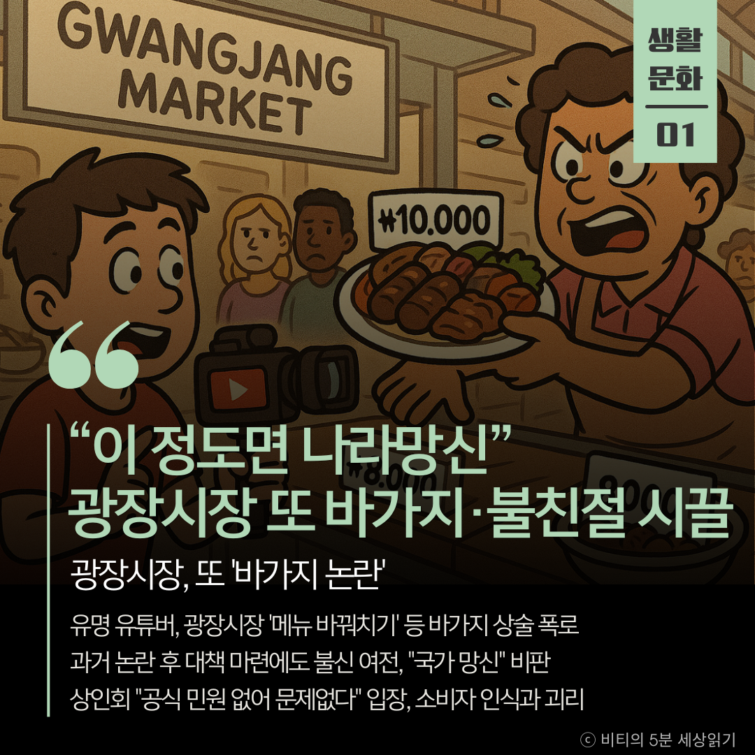 유명 유튜버가 광장시장에서 겪은 '메뉴 바꿔치기'불친절 응대 영상을 공개하며 '바가지 논란'이 재점화됐다. 과거 상인들이 결의대회까지 열었음에도 바가지 상술이 여전하다는 비판과 함께, 상인회는 "문제가 없다"는 입장이어서 불신이 커지고 있다.