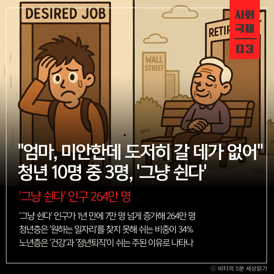 '그냥 쉰다'는 통계 뒤에는 '원하는 일자리가 없는' 청년층과 '건강이 나쁜' 노년층의 현실이 숨어있습니다. '쉬었음' 인구의 증가는 우리 사회의 활력이 그만큼 떨어지고 있다는 경고 신호입니다.