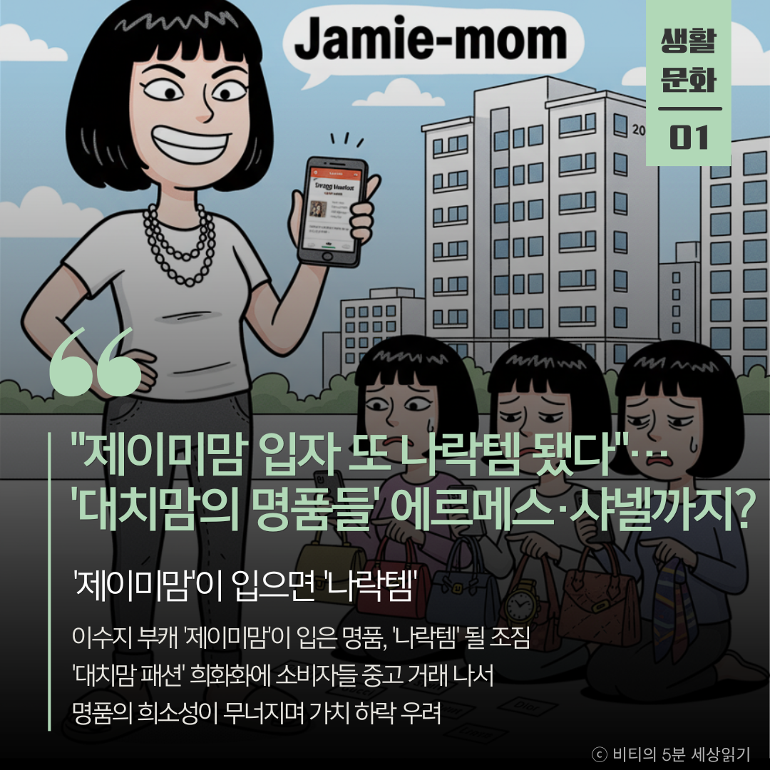 '제이미맘'이 입은 옷이 '대치맘 패션'의 상징처럼 희화화되자, 일부 소비자들이 "이제 못 입겠다"며 중고 거래에 내놓는 분위기입니다. 명품의 가치는 '희소성'에서 나오는데, 캐릭터 콘텐츠로 반복 노출되면서 그 가치가 희석된 결과입니다.