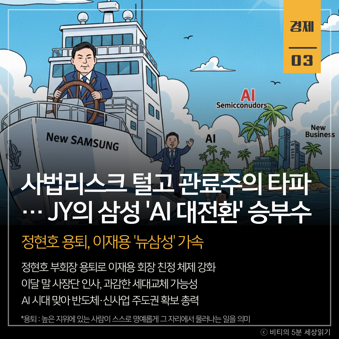 정현호 삼성전자 부회장의 용퇴로 이재용 회장은 온전히 스스로의 힘으로 '뉴삼성'을 이끌게 되었습니다. 오랜 혼란기를 거친 삼성그룹을 정상화하고 AI 시대의 주도권을 잡기 위한 대대적인 물갈이 인사가 이달 말 단행될 전망입니다.