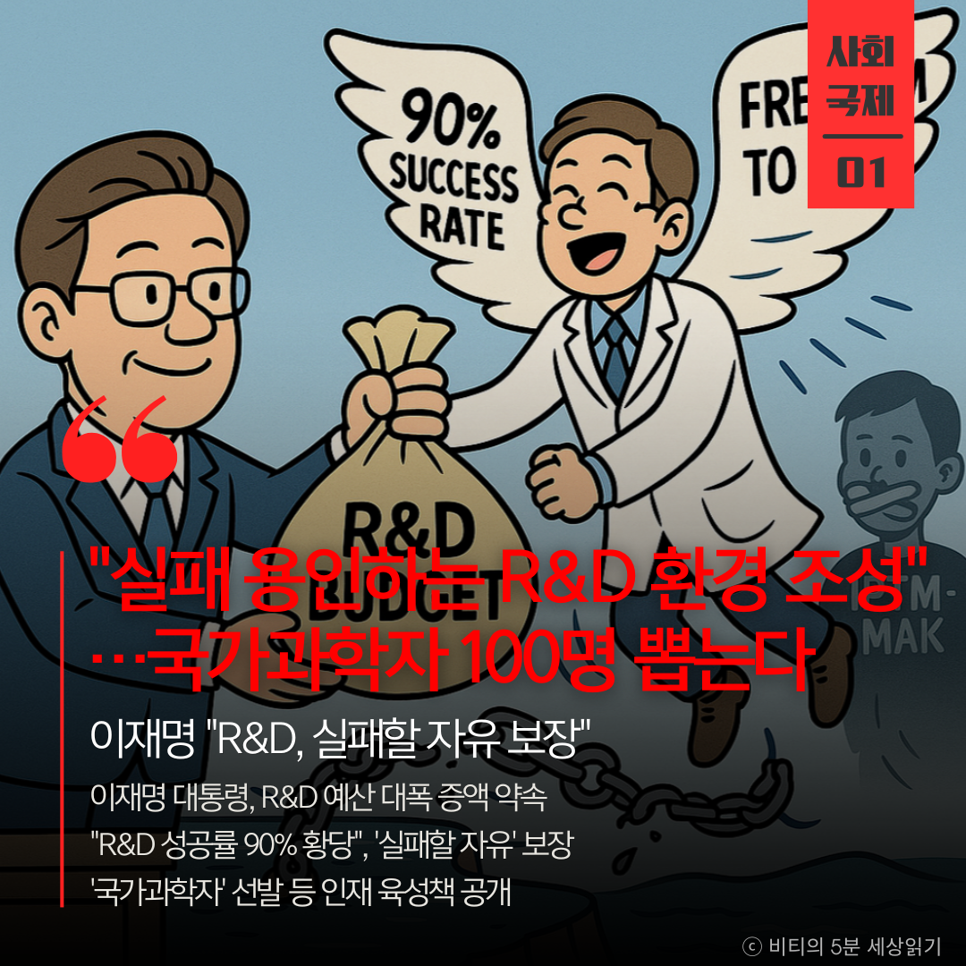 '실패할 자유'를 보장하겠다는 대통령의 약속은 R&D 예산 증액보다 더 중요한 메시지입니다. 성공만을 강요하는 문화에서는 혁신이 나올 수 없습니다. '황당한 90%' 성공률이 아닌, '의미 있는 10%'의 성공을 위한 환경 조성이 시급합니다.