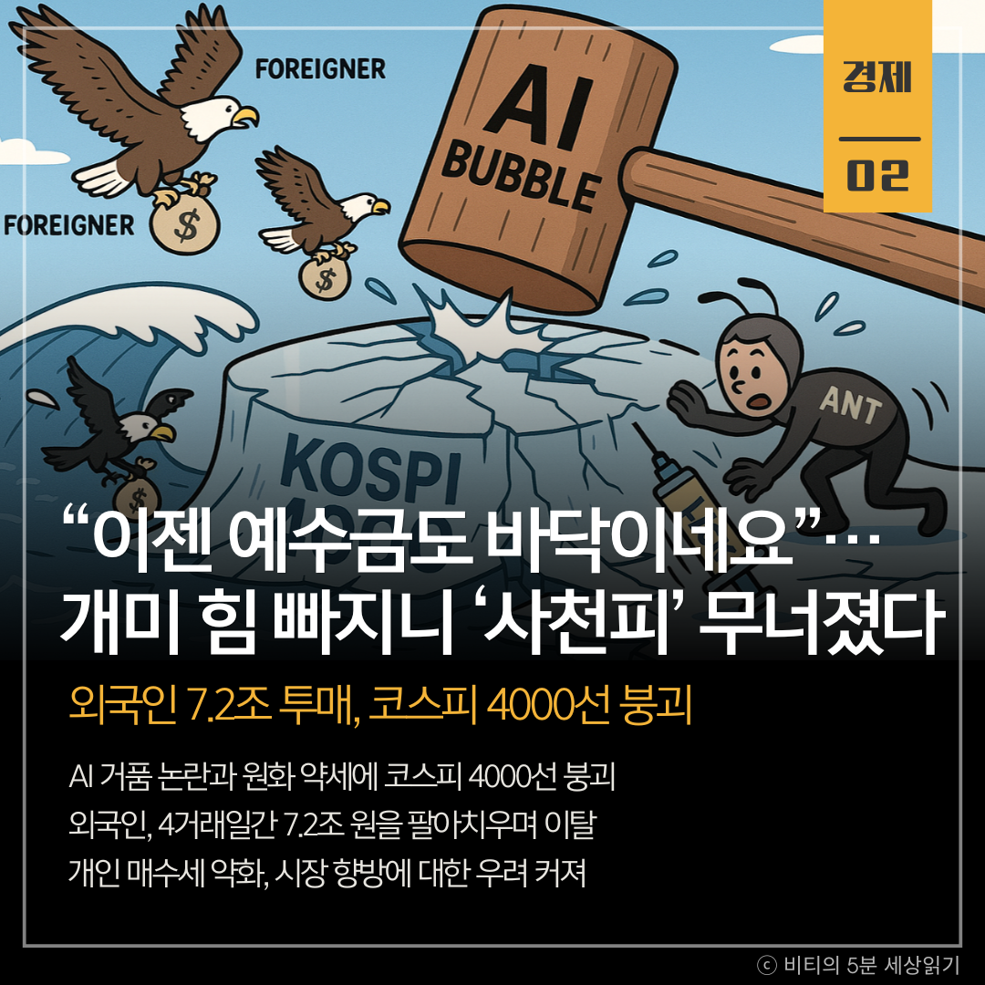 '사천피'를 외치던 축제 분위기가 외국인의 '매도 폭탄' 한 방에 얼어붙었습니다. AI 거품 논란과 환율 불안이라는 현실적 위협이 '묻지마 랠리'에 제동을 건 것입니다. 국민연금마저 매수 여력이 막힌 상황에서, '개미'들의 방어선이 언제까지 버틸 수 있을지 시험대에 올랐습니다.