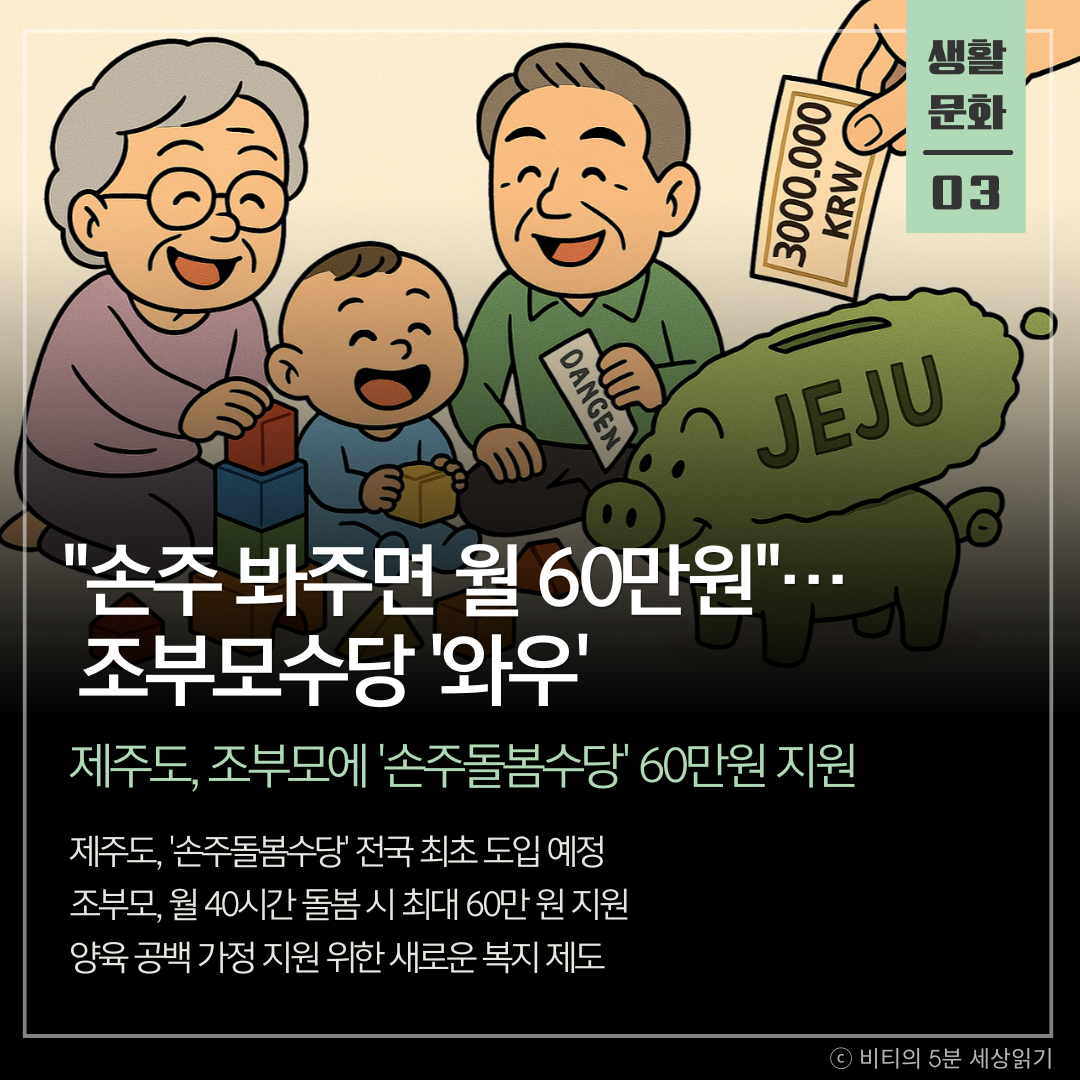 제주도가 양육 공백 해소를 위해 전국 최초로 '손주돌봄수당'을 도입한다. 월 40시간 이상 손주를 돌보는 조부모에게 아동 1명당 30만 원(최대 60만 원)을 지원하는 제도다.
