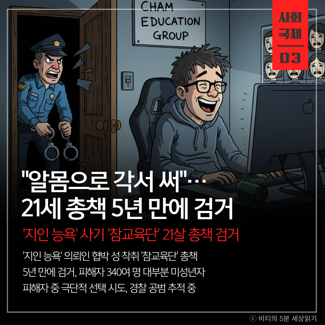 사이버 성 착취 범죄단체 '참교육단' 총책 21살 A씨가 범행 5년 만에 경찰에 붙잡혔습니다. 고등학생이던 2020년 조직을 결성한 A씨는 SNS에 '지인 능욕 사진'을 만들어준다고 광고한 뒤, 이를 요청한 의뢰인들을 협박했습니다. 그는 피해자들에게 알몸 상태로 각서를 쓰게 하는 등 가혹 행위를 했으며, 피해자는 340여 명에 달하고 대부분 미성년자였습니다. 일부 피해자는 극단적 선택을 하기도 했습니다. 경찰은 A씨를 구속하고, 남은 공범을 추적하고 있습니다.