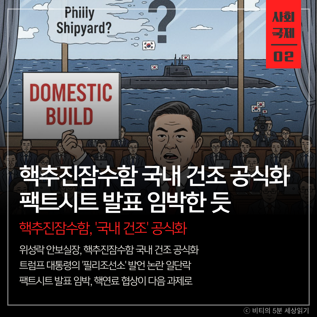 이는 지난달 말 한미 정상회담 이후 트럼프 대통령이 "필라델피아 조선소에서 건조할 것"이라고 밝혀 불거진 논란을 정면으로 반박한 것입니다. 위 실장의 발언으로 건조 장소를 둘러싼 미 정부 부처 간 이견이 정리됐다는 관측이 나오며, 한미 관세·안보합의 팩트시트 발표도 임박한 것으로 보입니다.