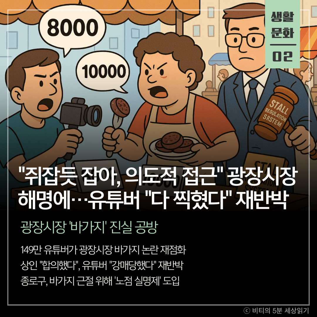 구독자 149만명 보유한 유튜버가 광장시장의 '바가지'를 고발해 잡음이 인 가운데, 지목된 광장시장 상인이 "유튜버가 날 쥐 잡듯 잡았다"며 사실과 다르다고 해명했다. 이에 유튜버는 "영상에 내