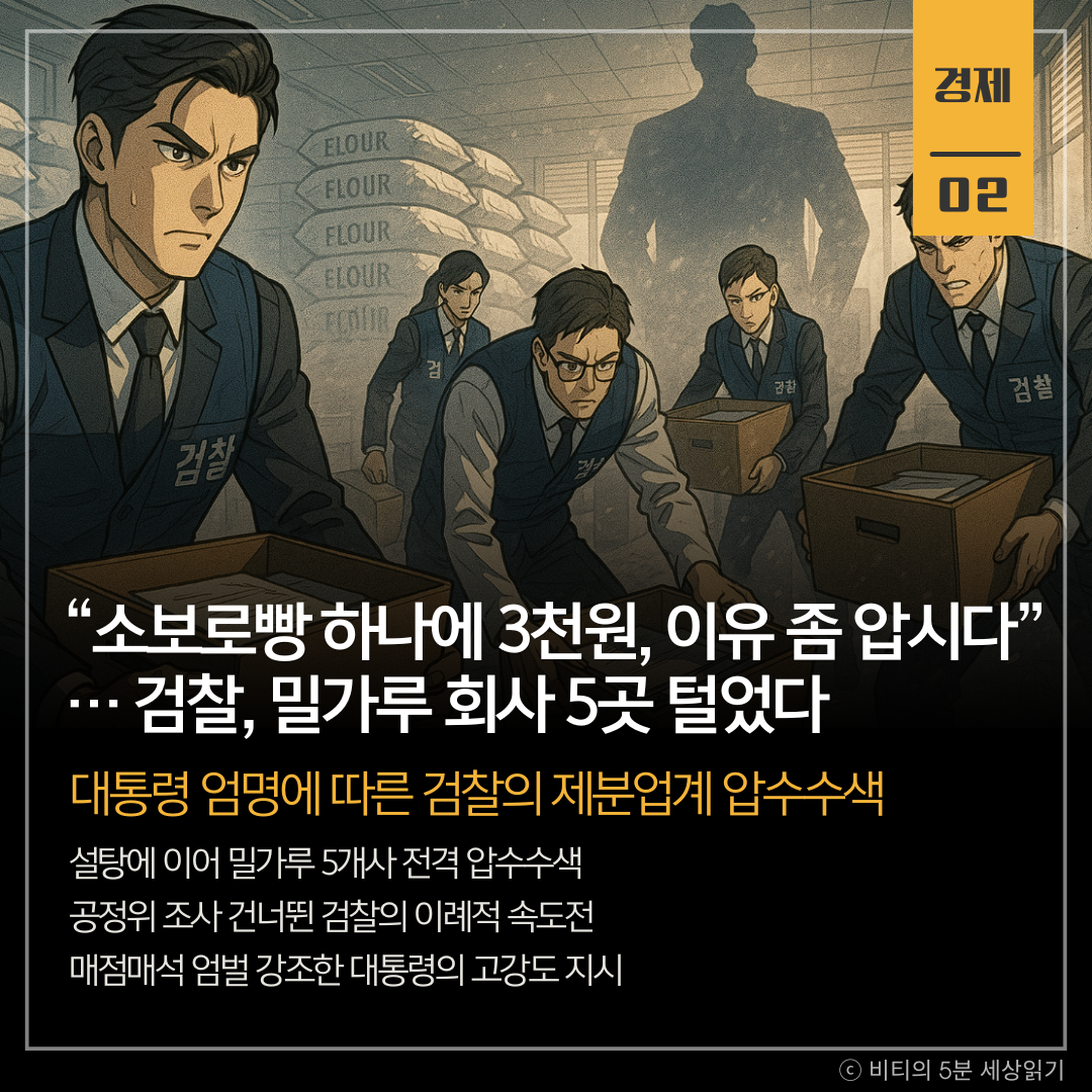 서울중앙지검이 대한제분, CJ제일제당 등 5개 주요 제분업체와 대표이사 사무실을 압수수색했습니다. 이는 지난 설탕 담합 기소에 이은 두 번째 조치인데요. 통상 1년 이상 걸리는 공정위의 행정 처분을 기다리지 않고 검찰이 독자적으로 수사에 착수한 점이 매우 이례적입니다. 이재명 대통령이 "조선시대엔 매점매석을 엄벌했다"며 강력한 단속을 주문한 직후라 강도 높은 조사가 예상되는데요. 협회장 사무실까지 포함된 걸 보면 조직적 개입 여부까지 샅샅이 털어볼 기세입니다.
