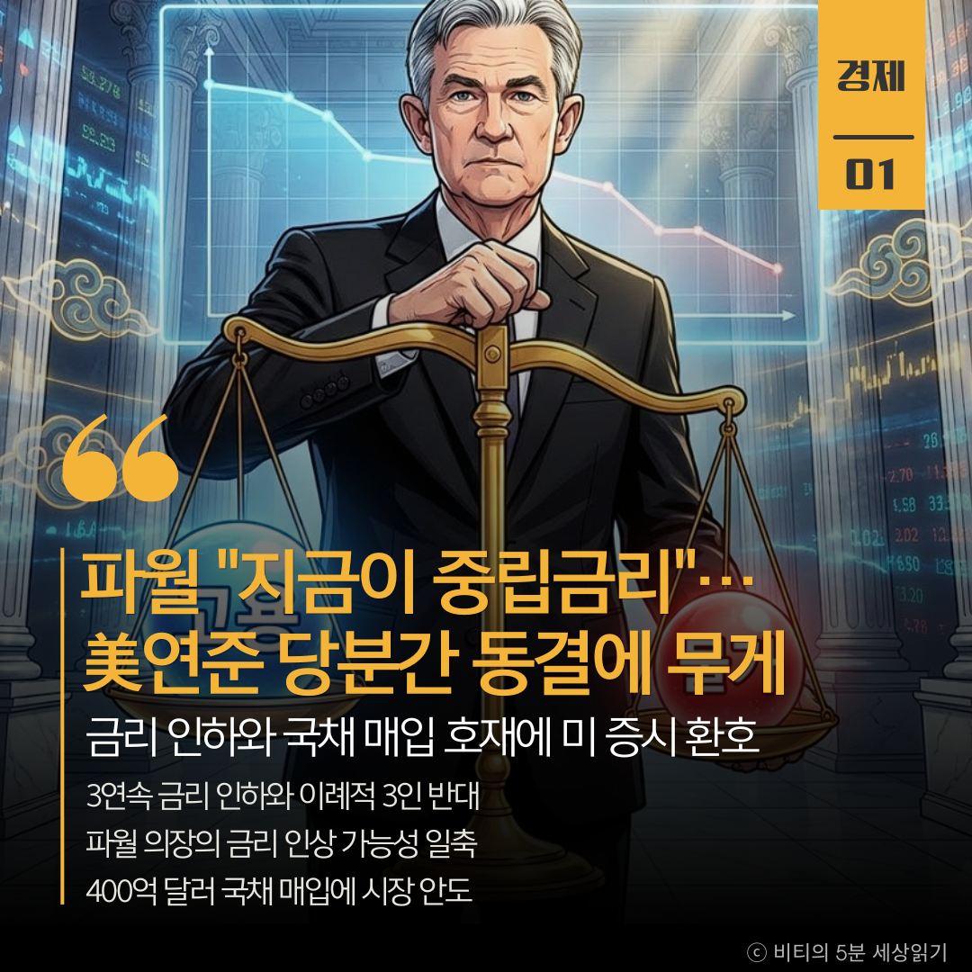 10일 연준은 기준금리를 0.25%포인트 내렸지만, 회의장 분위기는 심상치 않았습니다. 12명 중 3명이 반대해 2019년 이후 가장 큰 의견 차이를 보였거든요. 1명은 '빅컷'을, 2명은 '동결'을 주장했죠. 하지만 파월 의장은 "금리 인상 시나리오는 없다"고 못 박으며 관세 영향도 일시적일 것이라 안심시켰습니다. 여기에 연준이 양적긴축을 끝내고 400억 달러 규모의 단기 국채 매입을 재개한다는 '돈 풀기' 소식까지 더해지자 월가는 "기대 이상"이라며 반색했습니다.