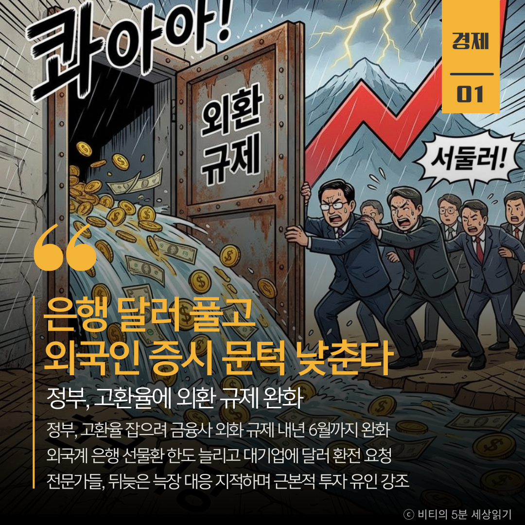 정부가 규제 완화에 이어 기업의 팔목까지 비틀며 달러 확보에 나선 모양새입니다. 그만큼 지금의 환율 상황을 심각한 위기로 보고 있다는 방증입니다. 하지만 급한 불을 끄기 위한 관치 성격의 개입은 시장의 내성을 키울 수 있습니다. 단기 처방을 넘어 한국 경제의 매력도를 높여 외국 자본이 제 발로 찾아오게 만드는 근본적인 펀더멘털 강화가 시급해 보입니다.