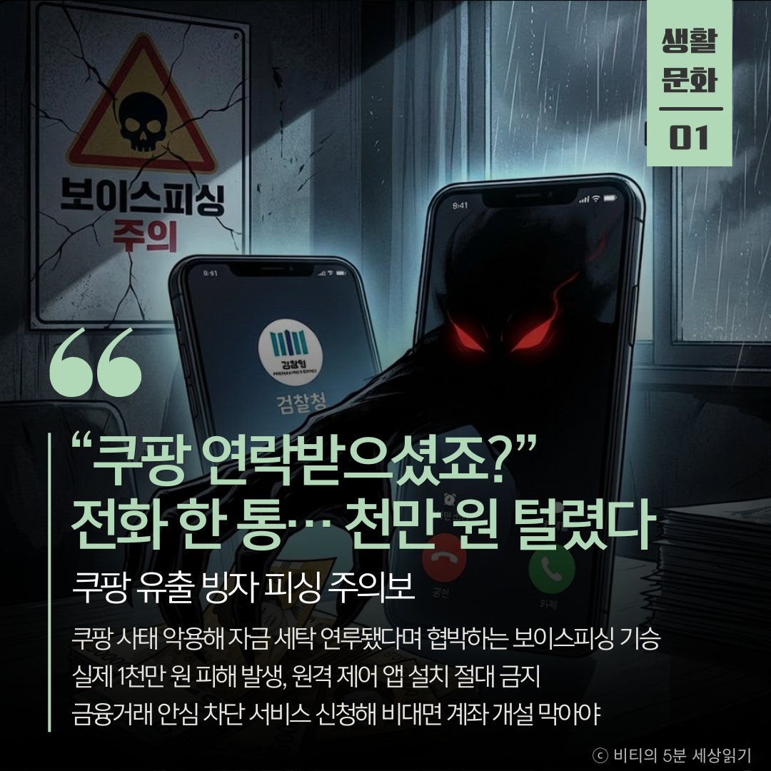 쿠팡 정보 유출 사태를 악용한 보이스피싱이 기승을 부려 실제 금전 피해까지 발생했습니다. 금융거래 안심 차단 서비스 신청 등 각별한 주의가 필요합니다.