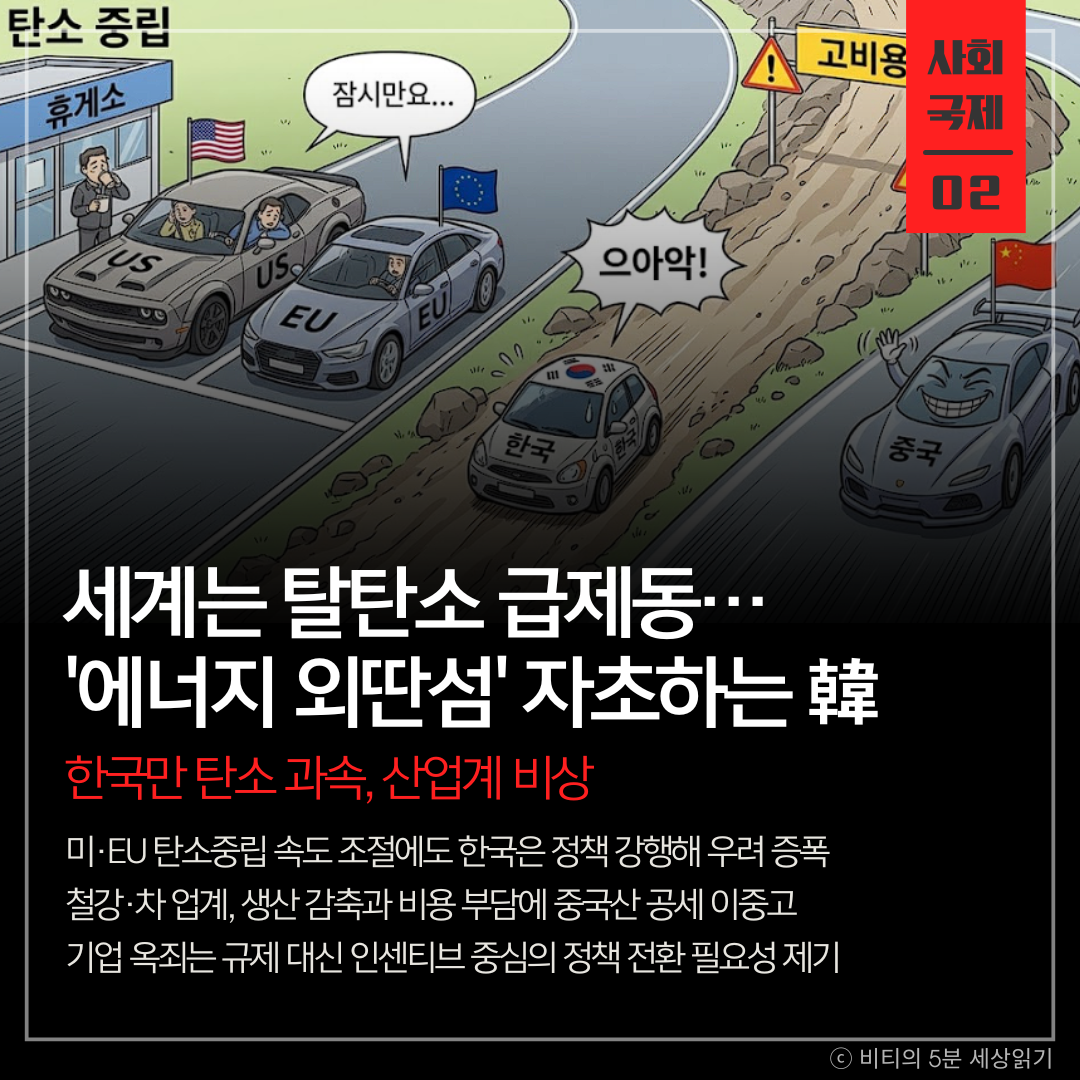 명분만 쫓다가 실리를 잃을 수 있는 위기 상황입니다. 제조업 비중이 높은 한국 경제 구조상 준비 없는 급격한 탄소중립은 산업 공동화를 초래할 수 있습니다. 규제라는 채찍만 휘두르기보다 기업이 자생력을 갖추고 전환할 수 있도록 당근(인센티브)을 제시하고, 글로벌 속도에 맞춘 유연한 정책 운용이 절실한 시점입니다.