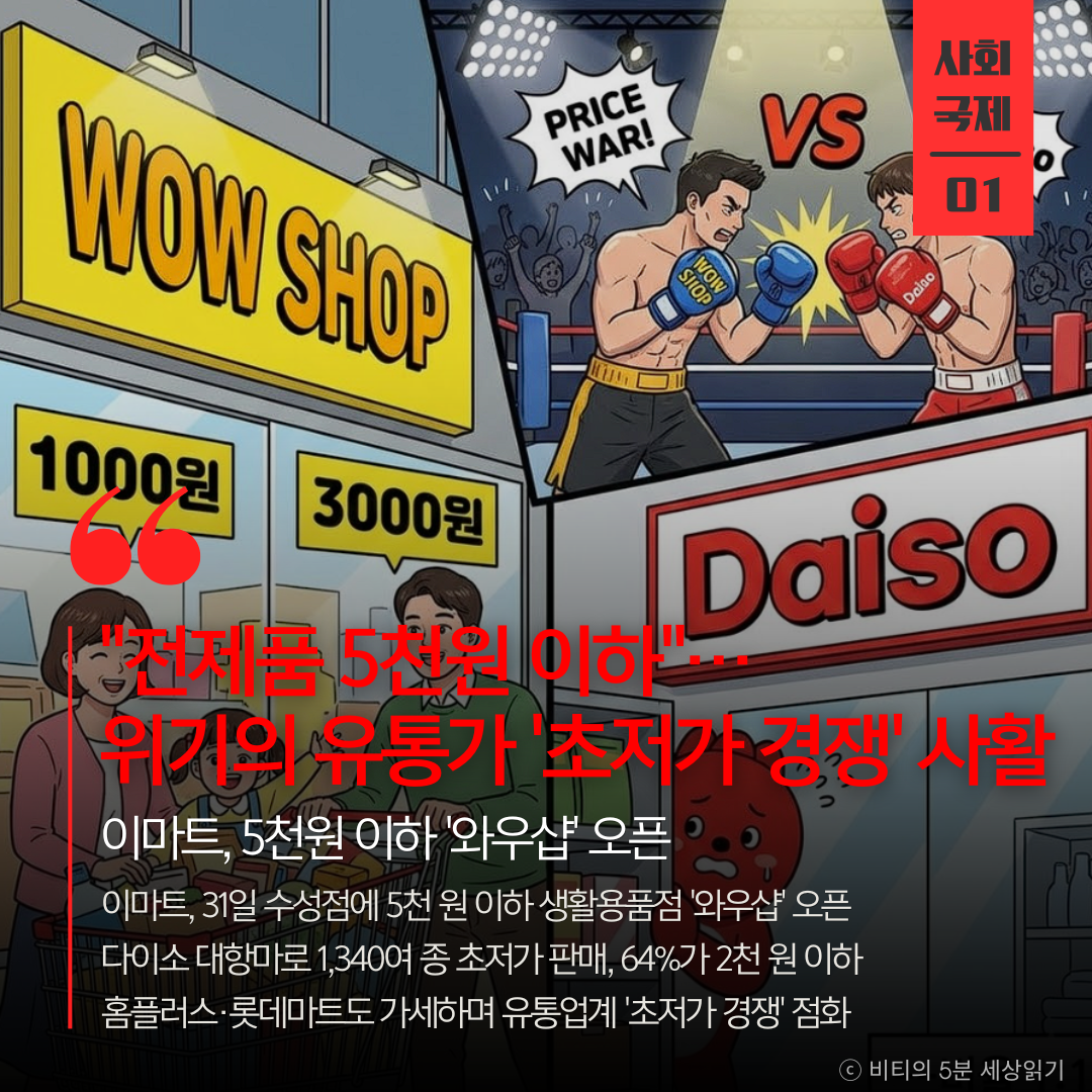 이마트가 5천 원 이하 초저가 생활용품 전문점 '와우샵'을 론칭하며 다이소에 도전장을 냈습니다. 고물가 시대, 대형마트들의 생존을 위한 '가성비 전쟁'이 본격화되었습니다.
