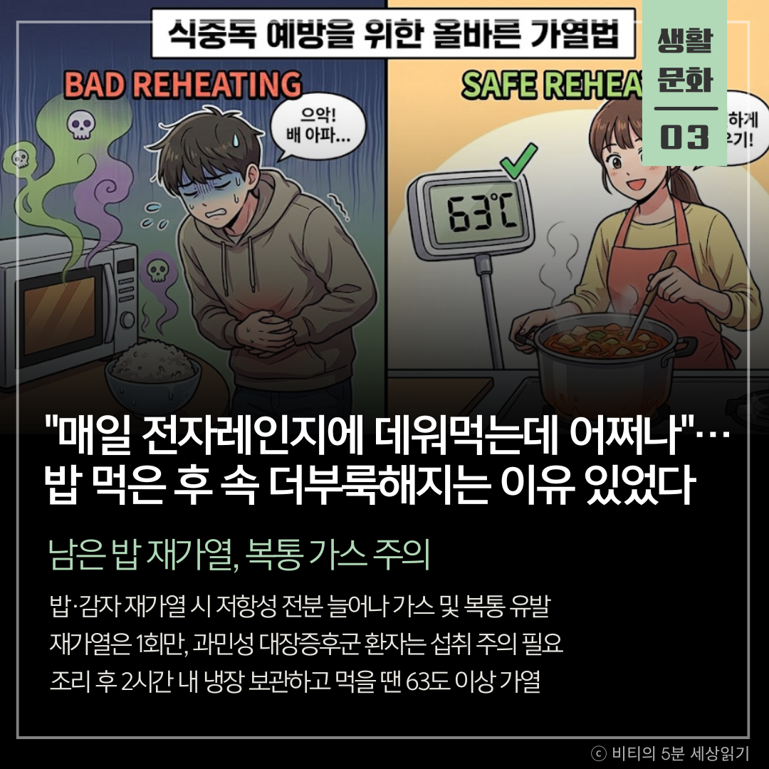 흰쌀밥이나 감자 등 탄수화물 식품을 재가열하면 소화가 잘 안 되는 저항성 전분이 늘어나 복통과 가스를 유발할 수 있습니다. 안전을 위해 재가열은 한 번만 하고, 충분히 뜨겁게 데워야 합니다.