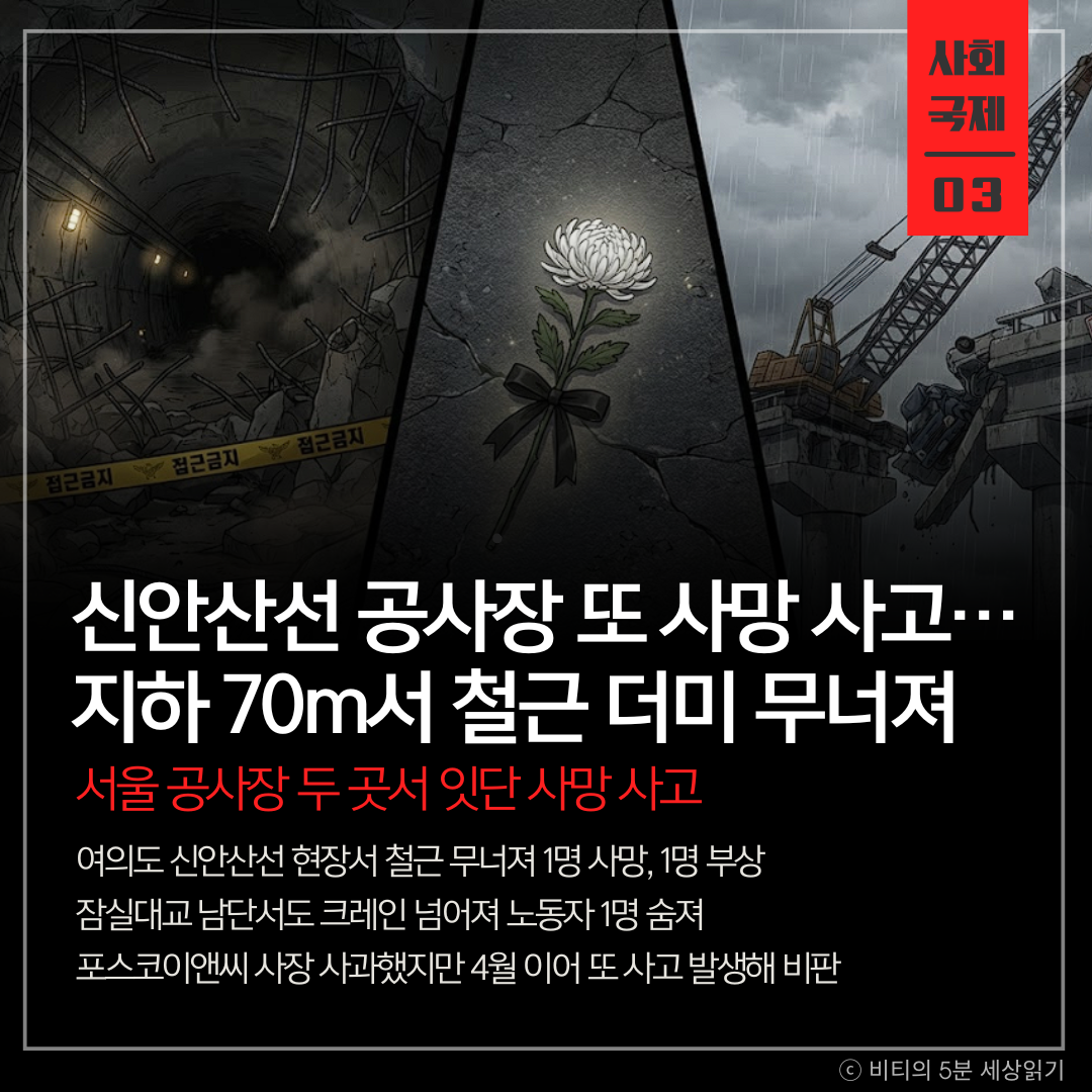 18일 서울 도심 공사장 두 곳에서 안타까운 사망 사고가 잇따랐습니다. 오후 1시 22분경 여의도 신안산선 공사 현장 지하 70m 지점에서 콘크리트 타설 중 철근 구조물이 무너져 내렸습니다. 이 사고로 50대 노동자 1명이 머리를 다쳐 숨졌고, 다른 1명은 부상을 입었습니다. 해당 공구 시공사인 포스코이앤씨의 송치영 사장은 "책임을 통감한다"며 사과문을 발표했습니다. 이 현장은 지난 4월에도 사망 사고가 있었던 노선이라 논란이 예상됩니다.
