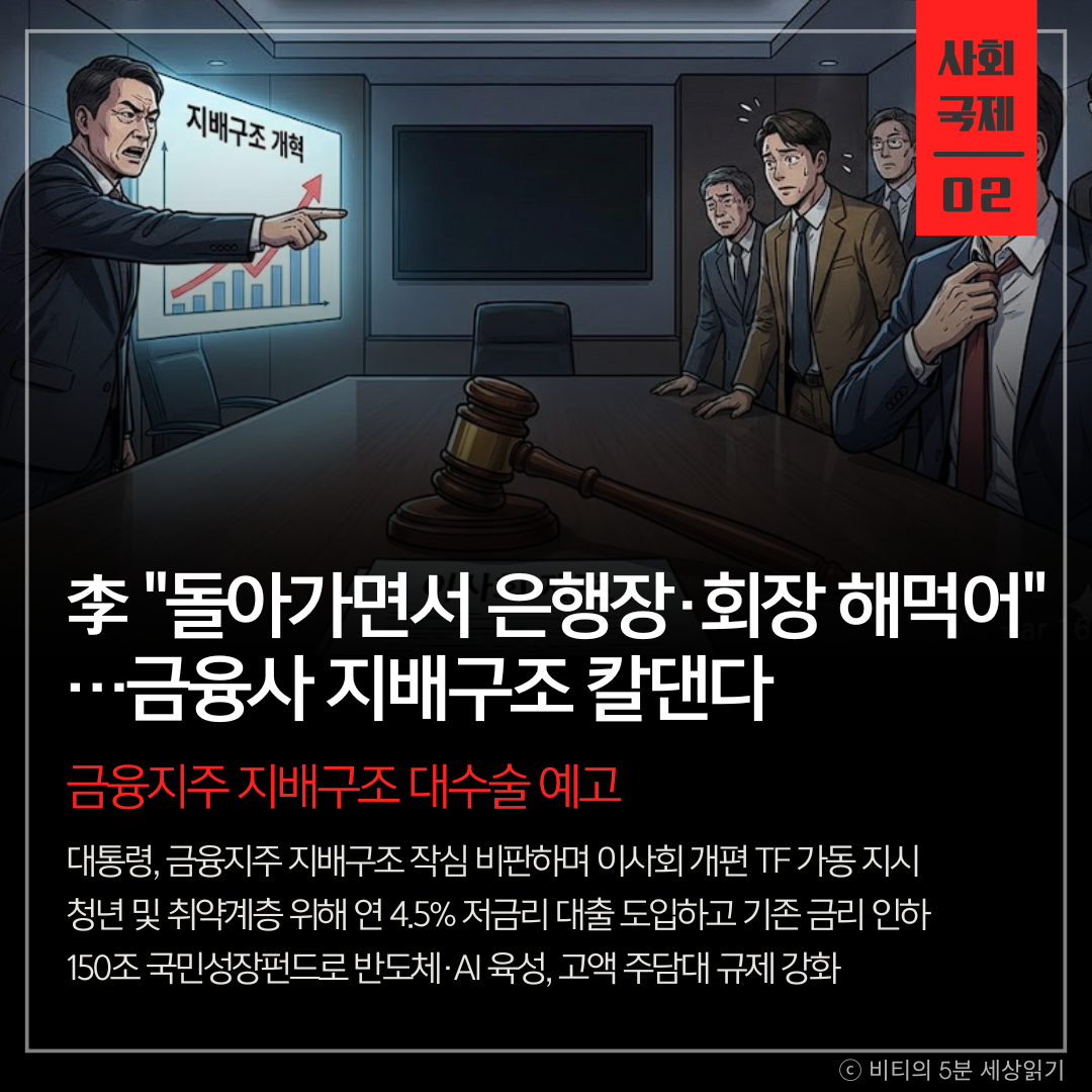 이재명 대통령이 금융지주의 폐쇄적인 지배구조와 수익 추구 행태를 강하게 비판하며 대대적인 개혁을 주문했습니다. 이에 금융 당국은 이사회 구성을 손보는 한편, 취약계층을 위한 금리 인하와 150조 원 규모의 미래 산업 투자 계획을 내놨습니다.