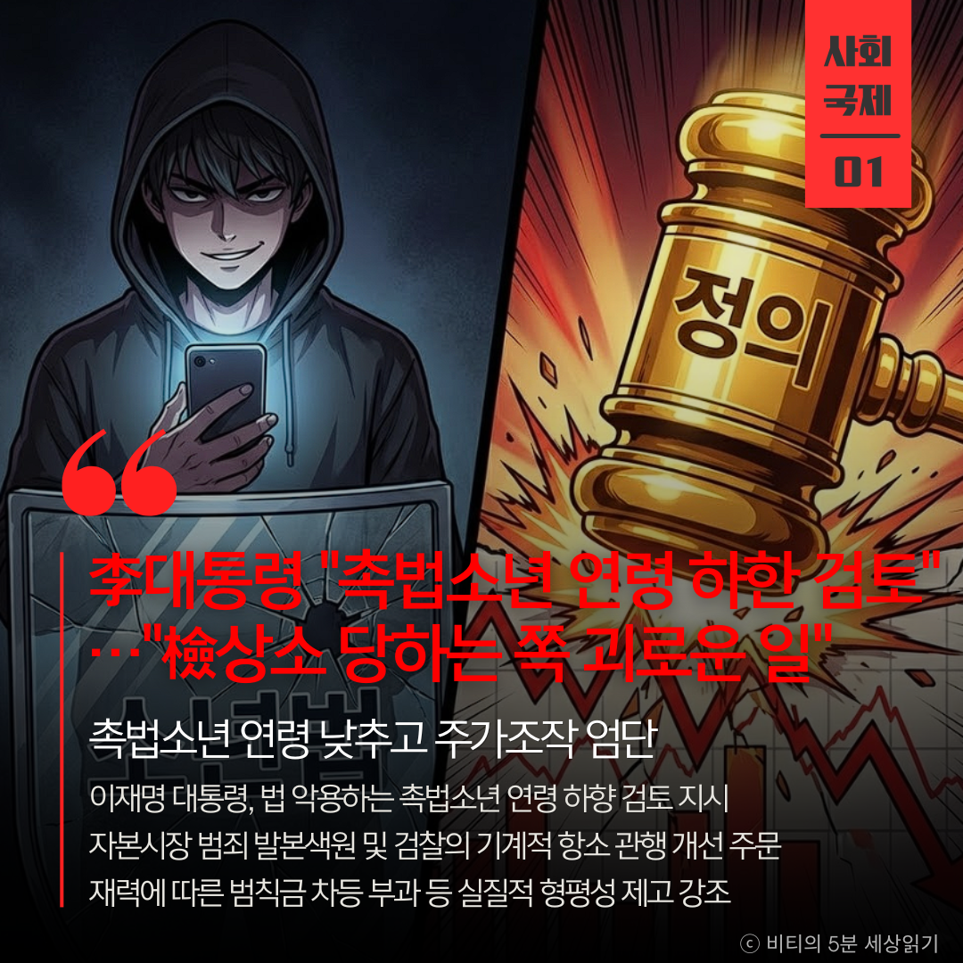 이재명 대통령은 19일 법무부·대검찰청 업무보고에서 "촉법소년이라며 법을 악용하는 사례가 많다"며 형사 미성년자 연령 하향 검토를 지시했습니다. 또한 주가조작 등 자본시장 교란 행위에 대해서는 "시도조차 못 하게 막아야 한다"며 강력한 처벌을 강조했습니다.