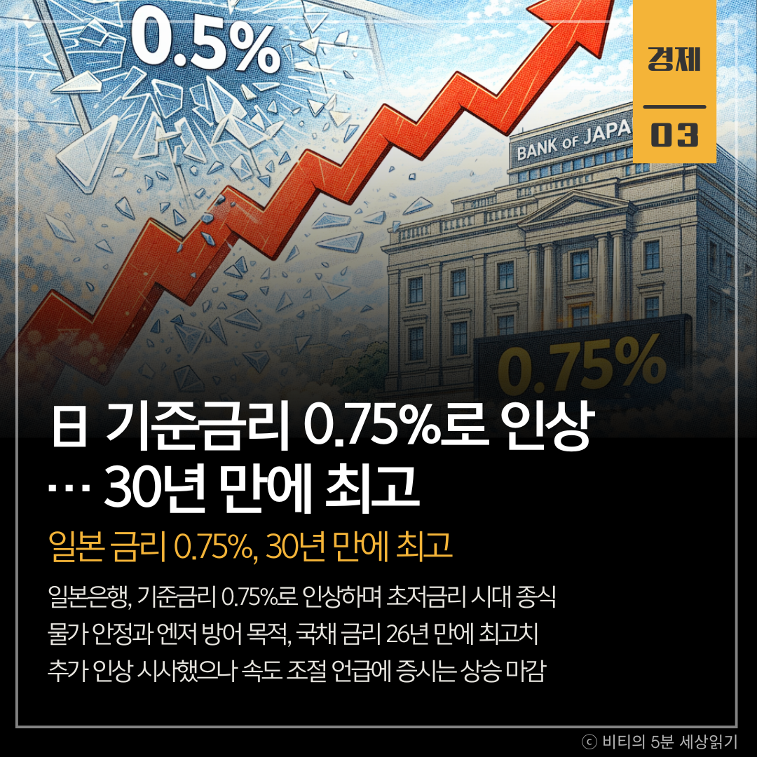 일본은행이 기준금리를 0.75%로 인상하며 30년 만에 초저금리 시대의 마침표를 찍었습니다. 고물가와 엔저를 방어하기 위한 결단으로, 향후 추가 인상 가능성도 시사했습니다.