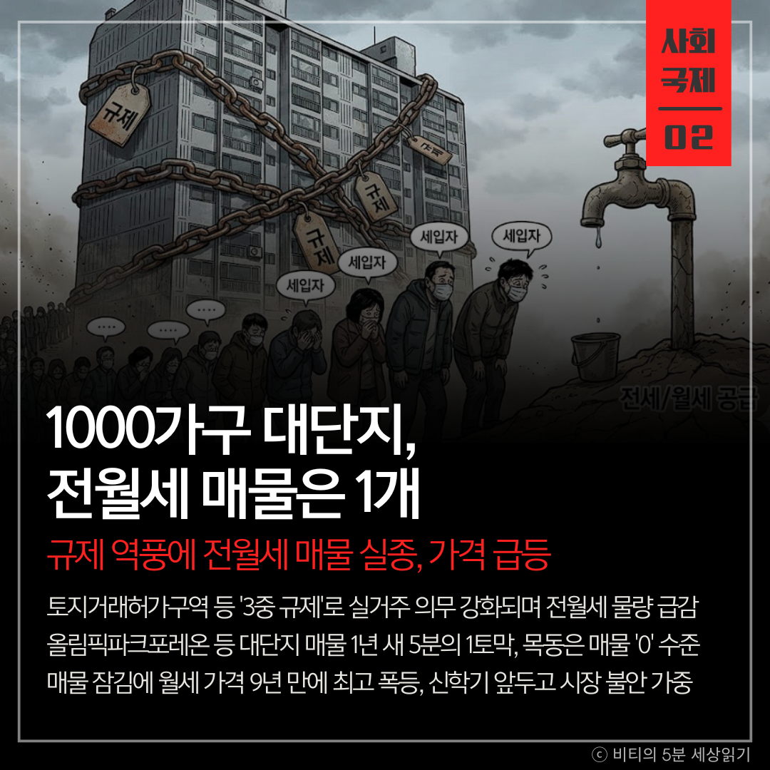 정부의 10·15 대책(토지거래허가구역 확대 등)으로 실거주 의무가 강화되면서, 전월세 매물이 급감하고 가격이 치솟는 '물량 가뭄' 현상이 서울과 경기 남부권을 강타했습니다.
