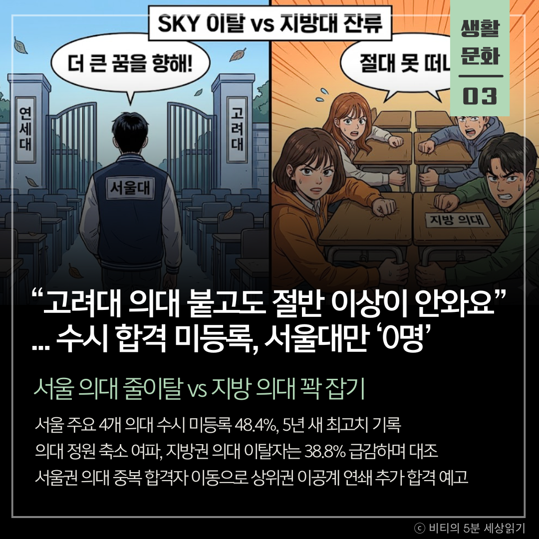 2026학년도 수시 모집에서 서울대, 고려대, 연세대 등 서울 주요 의대 합격생들의 미등록 비율이 5년 만에 최고치를 기록했습니다. 반면, 모집 정원이 줄어든 지방권 의대는 이탈자가 급감하여 서울과 지방 간의 뚜렷한 온도 차를 보였습니다.