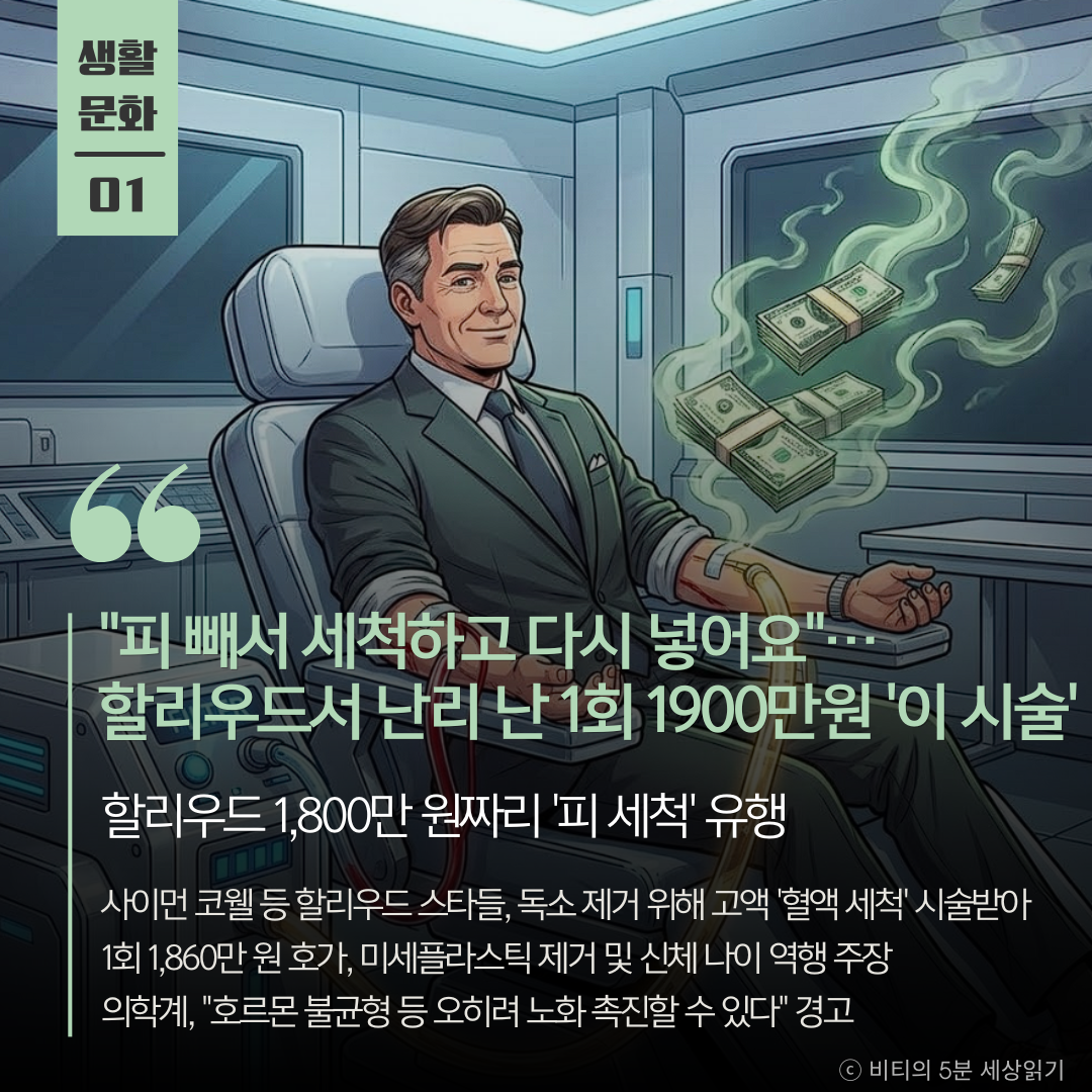 유명 프로듀서 사이먼 코웰 등 할리우드 초부유층 사이에서 젊음을 유지하기 위해 혈액을 세척해 재주입하는 시술이 유행하고 있으나, 의학적 효능과 부작용에 대한 논란이 일고 있습니다.