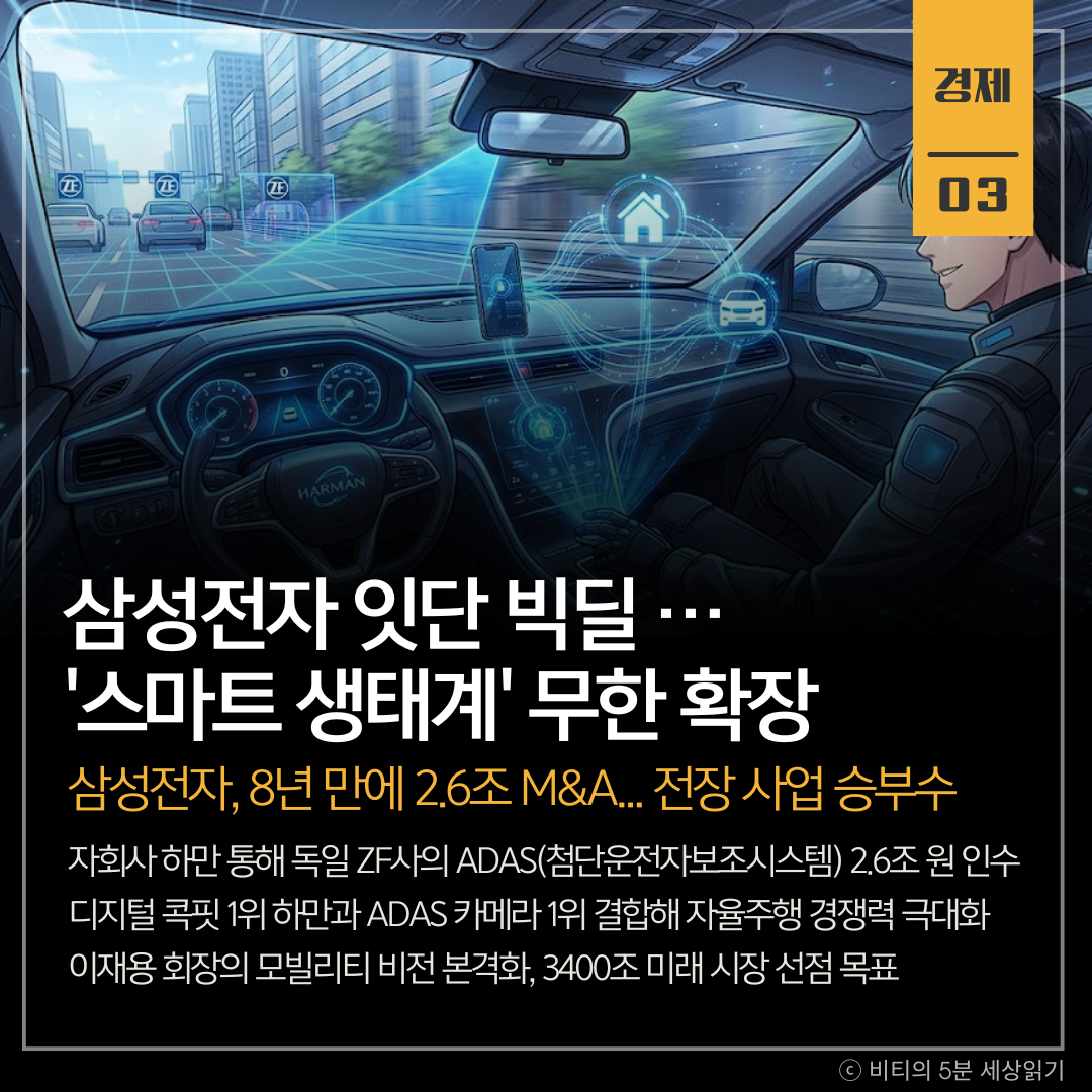 삼성전자의 자회사 하만이 독일 ZF사의 첨단운전자보조시스템(ADAS) 사업을 약 2조 6000억 원에 인수했습니다. 이는 2017년 하만 인수 이후 8년 만에 성사된 그룹 차원의 최대 규모 M&A로, 미래 모빌리티 시장 선점을 위한 승부수입니다.
